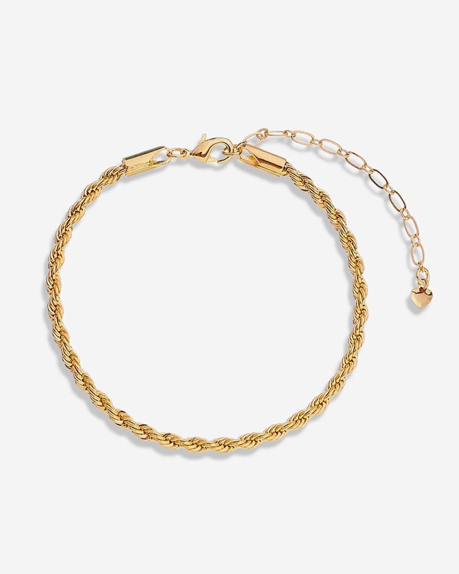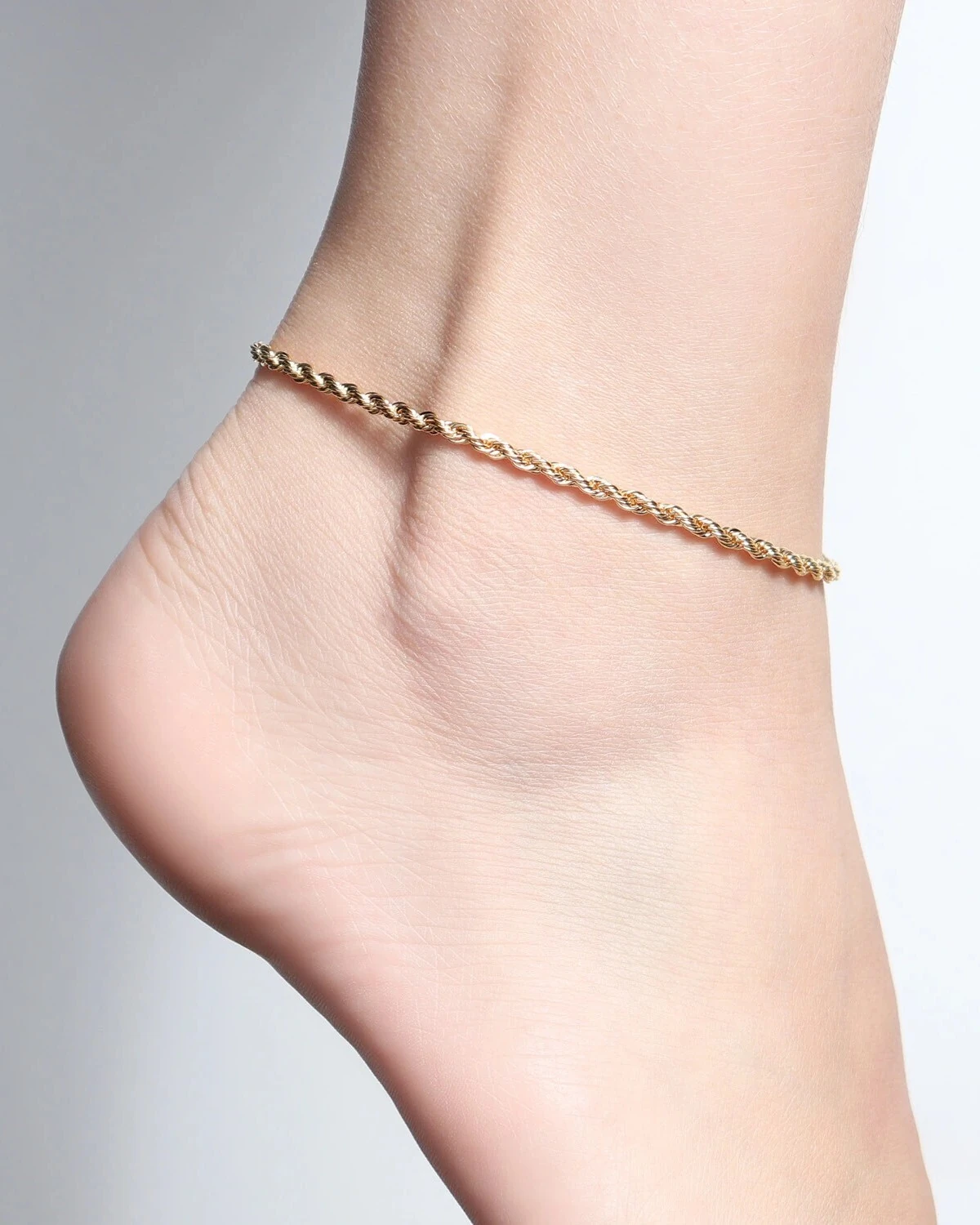Tornozeleira clássica em banho de Ouro18k no modelo Cordão Baiano fino. A estrutura entrelaçada dos elos proporciona maior resistência e um brilho espelhado característico.