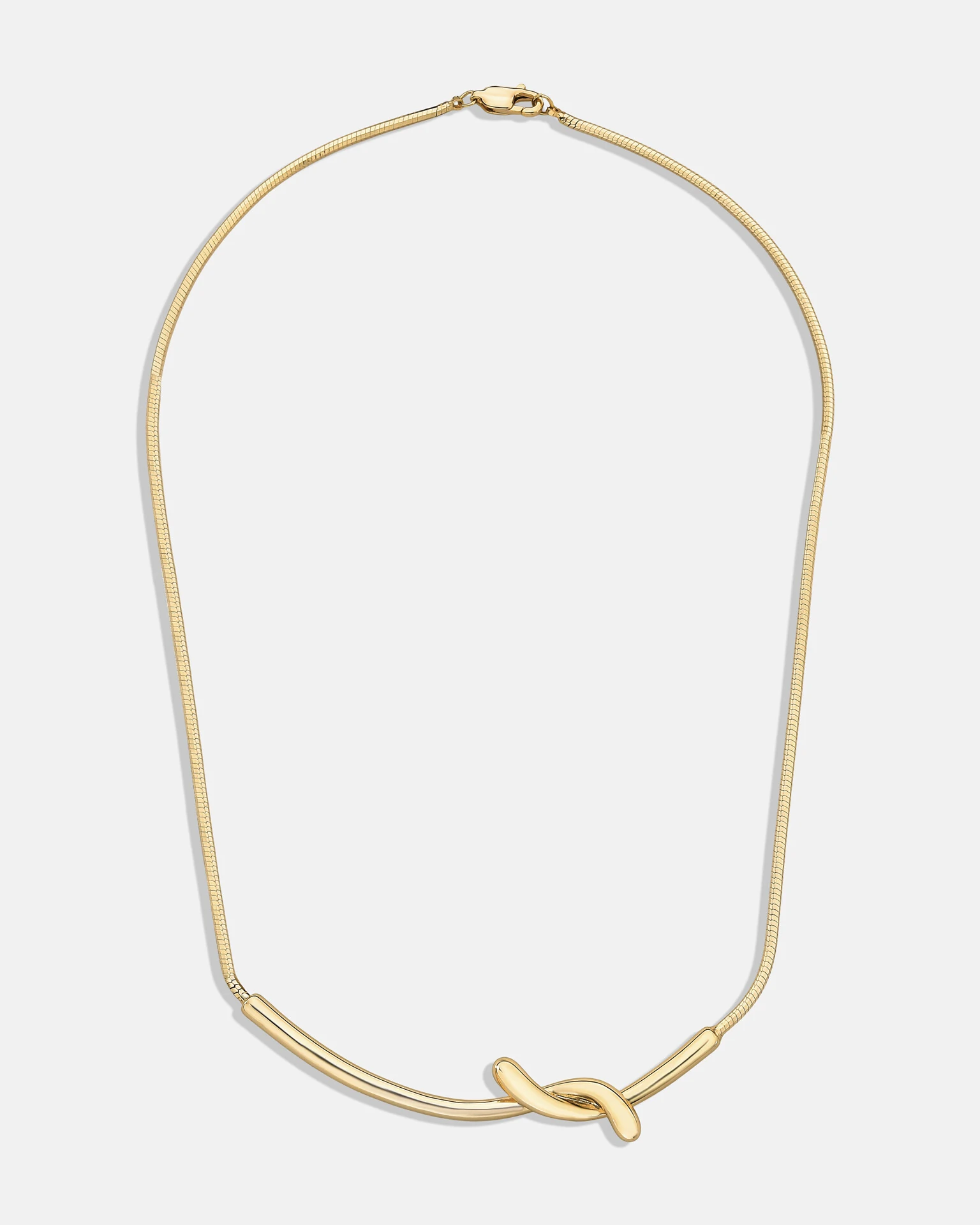 O Colar Clair com corrente delicada em banho de ouro 18k, com design minimalista e elegante.Com corrente fina, de estilo malha lisa e contínua o que dá um acabamento sofisticado e flexível. Na parte frontal, há um pingente, formado por duas barras curvas que se cruzam, criando um nó suave e assimétrico.