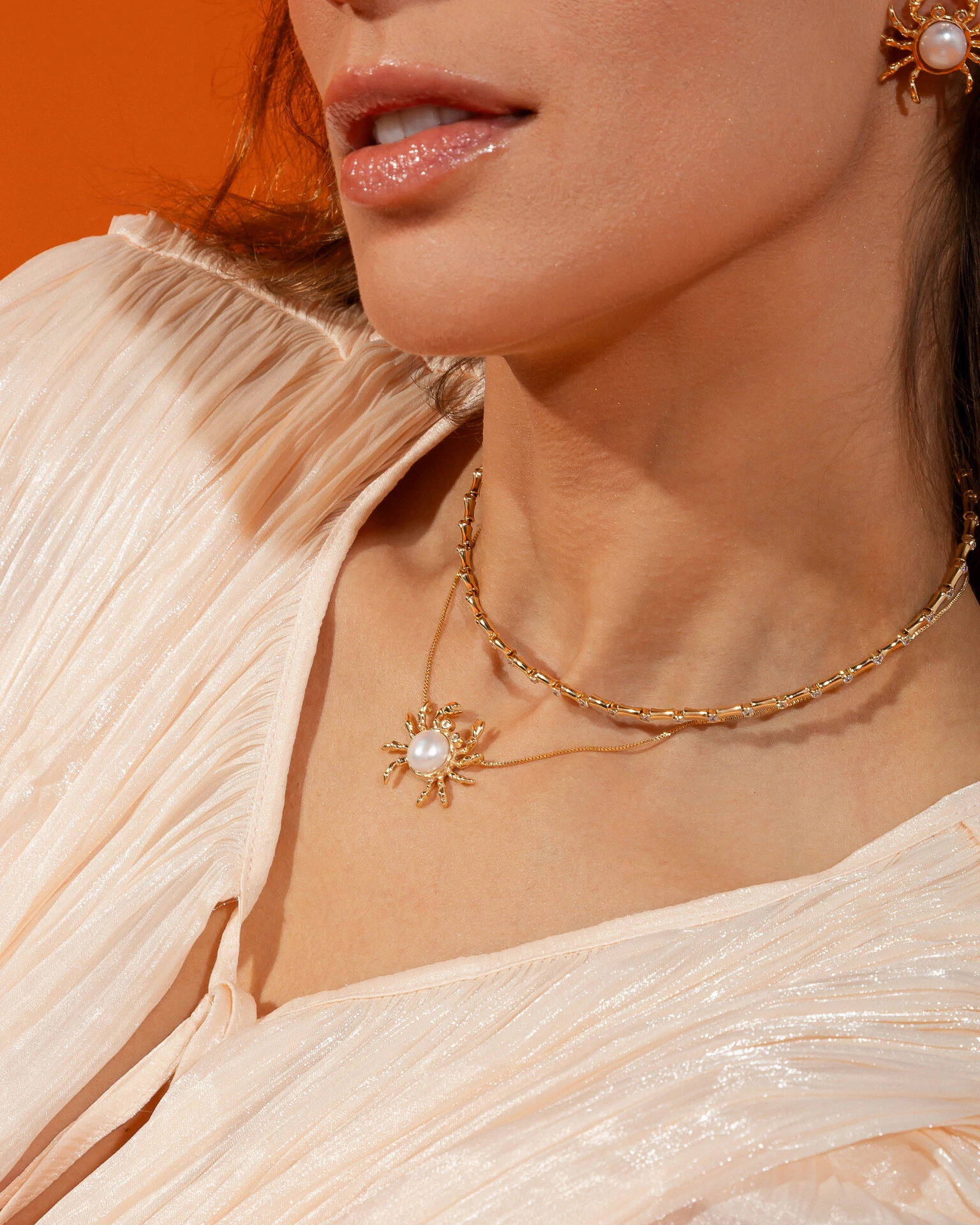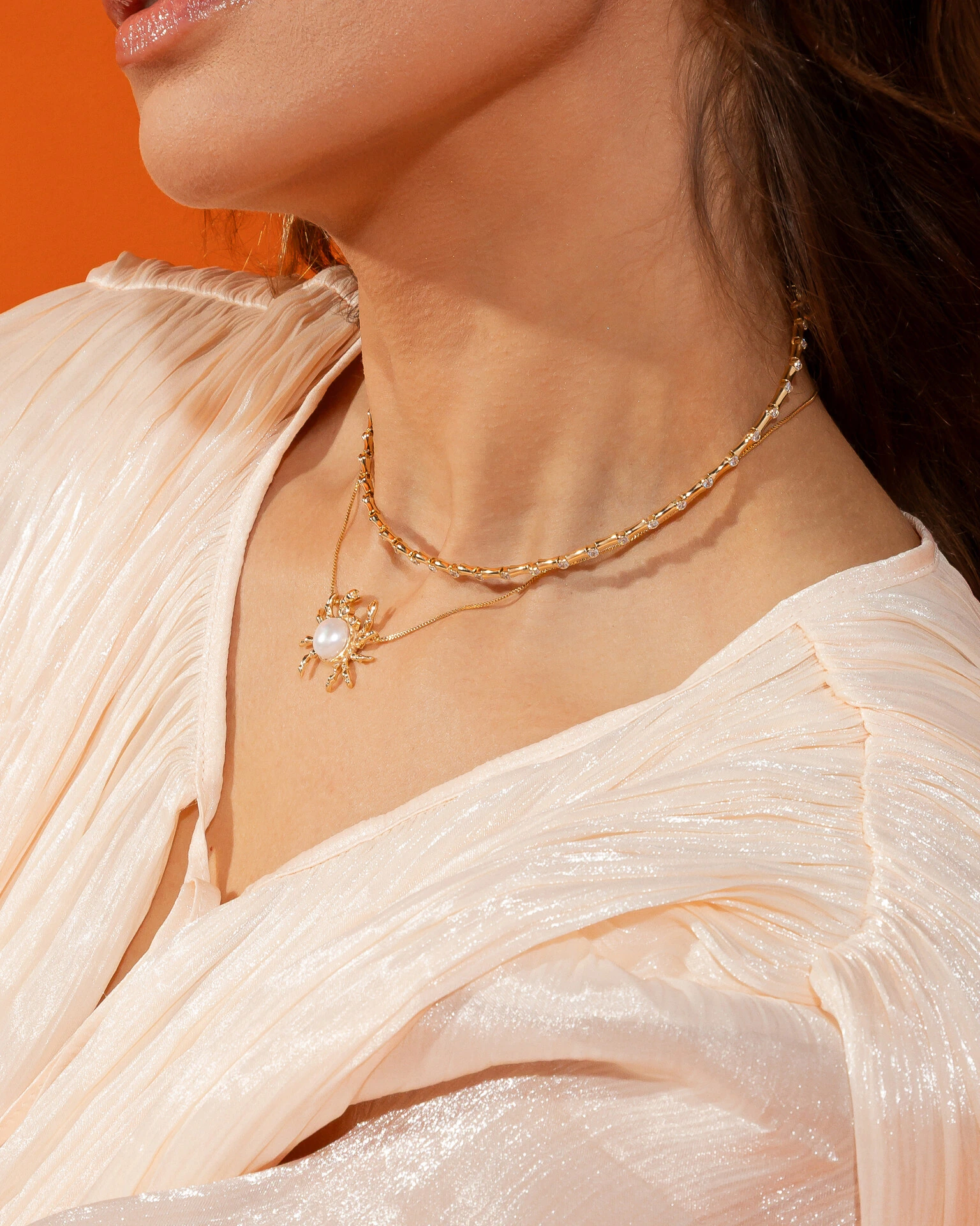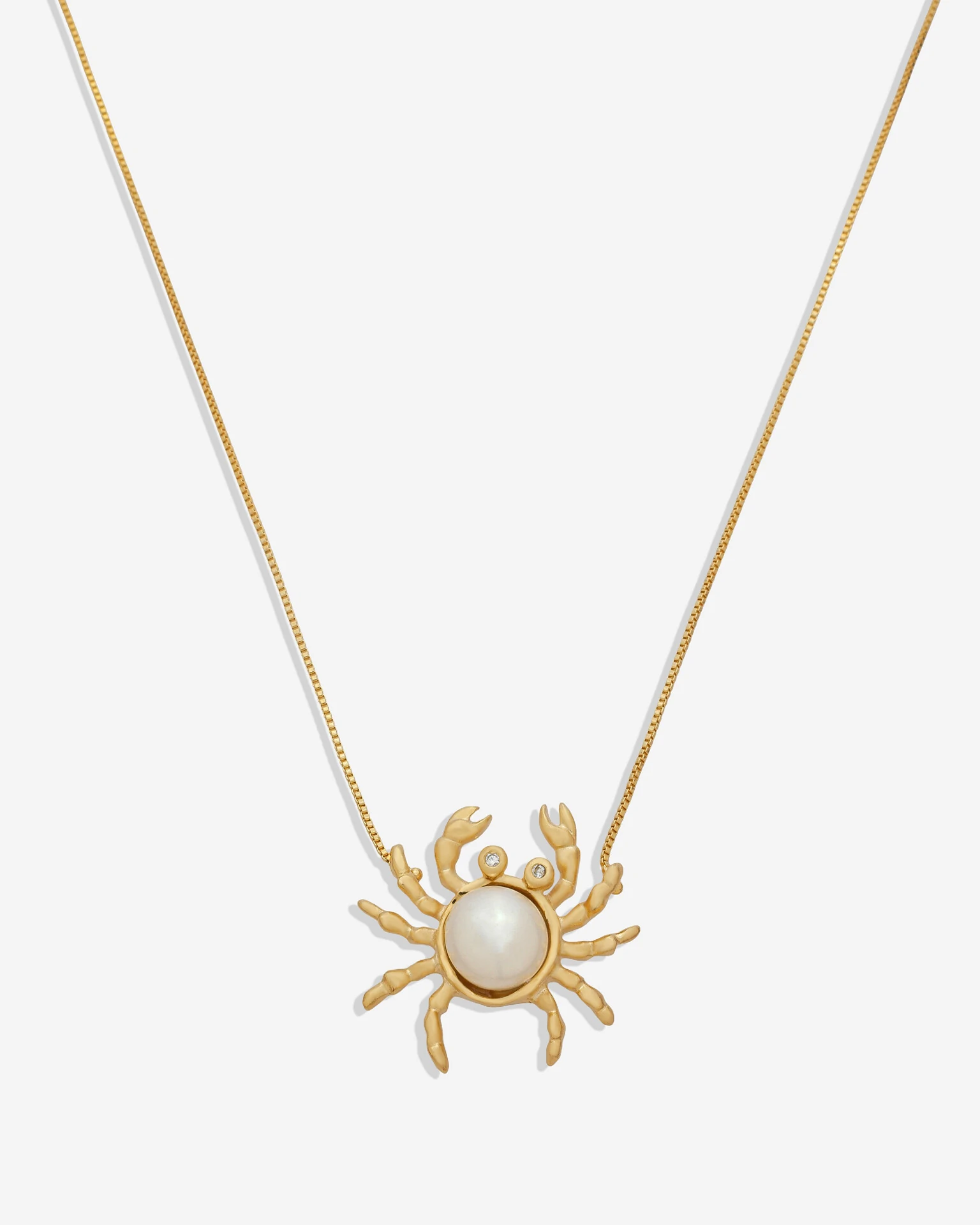 O design encantador de um pequeno siri de garras afiadas, apresenta em seu corpinho uma bela pérola shell e olhinhos em mini zircônias cristais. O maravilhoso brilho do banho de ouro 18k se une ao conjunto para trazer um toque sutil de refinamento ao Colar Siri Dourado.