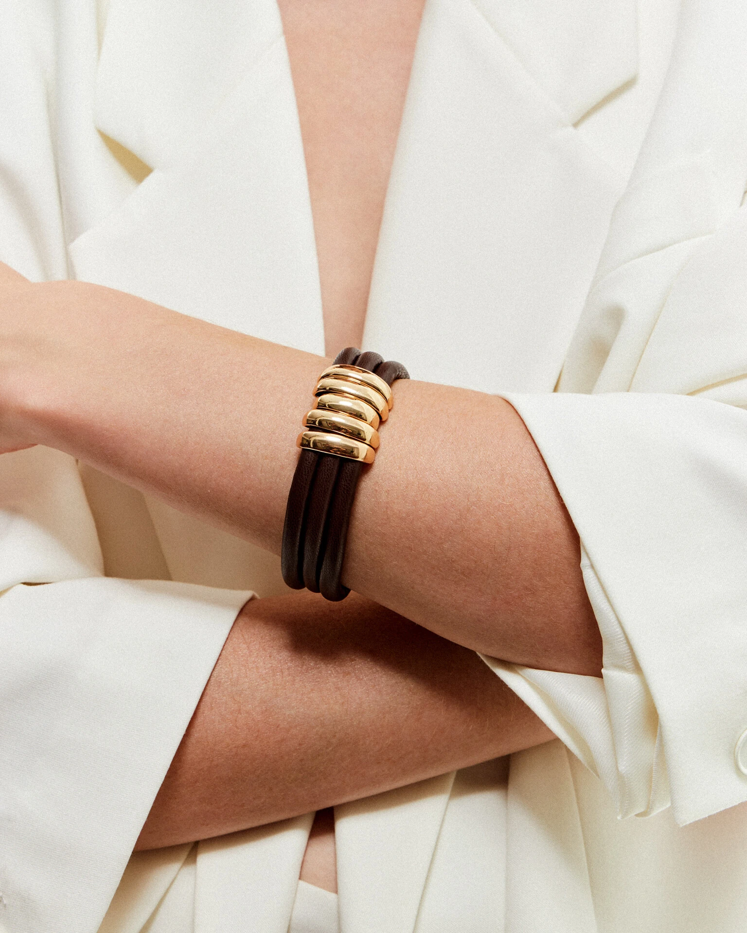 Audaciosa e super contemporânea com um design repleto de estilo, a pulseira Corino, abusa da elegante tonalidade marrom que reveste seus três aros e do contraste vibrante que resulta do banho de ouro 18k de seus encantadores detalhes.