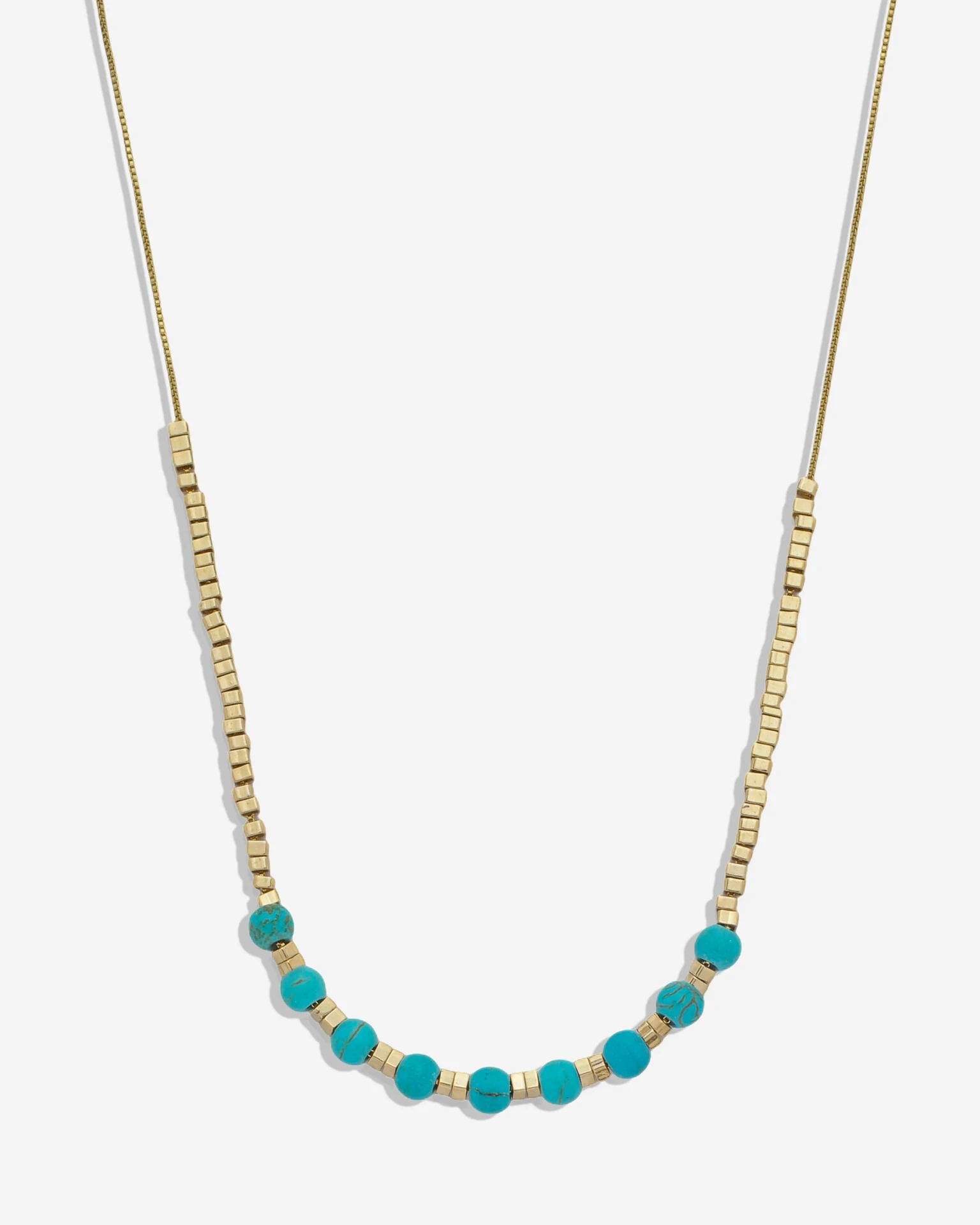 A delicada corrente de elos Veneziana é recoberta por pequenos canutilhos quadrados dourados e contas em Turquesa Howlita, o que faz com que esta charmosa Choker seja o acessório ideal para complementar com estilo seus looks do dia a dia.