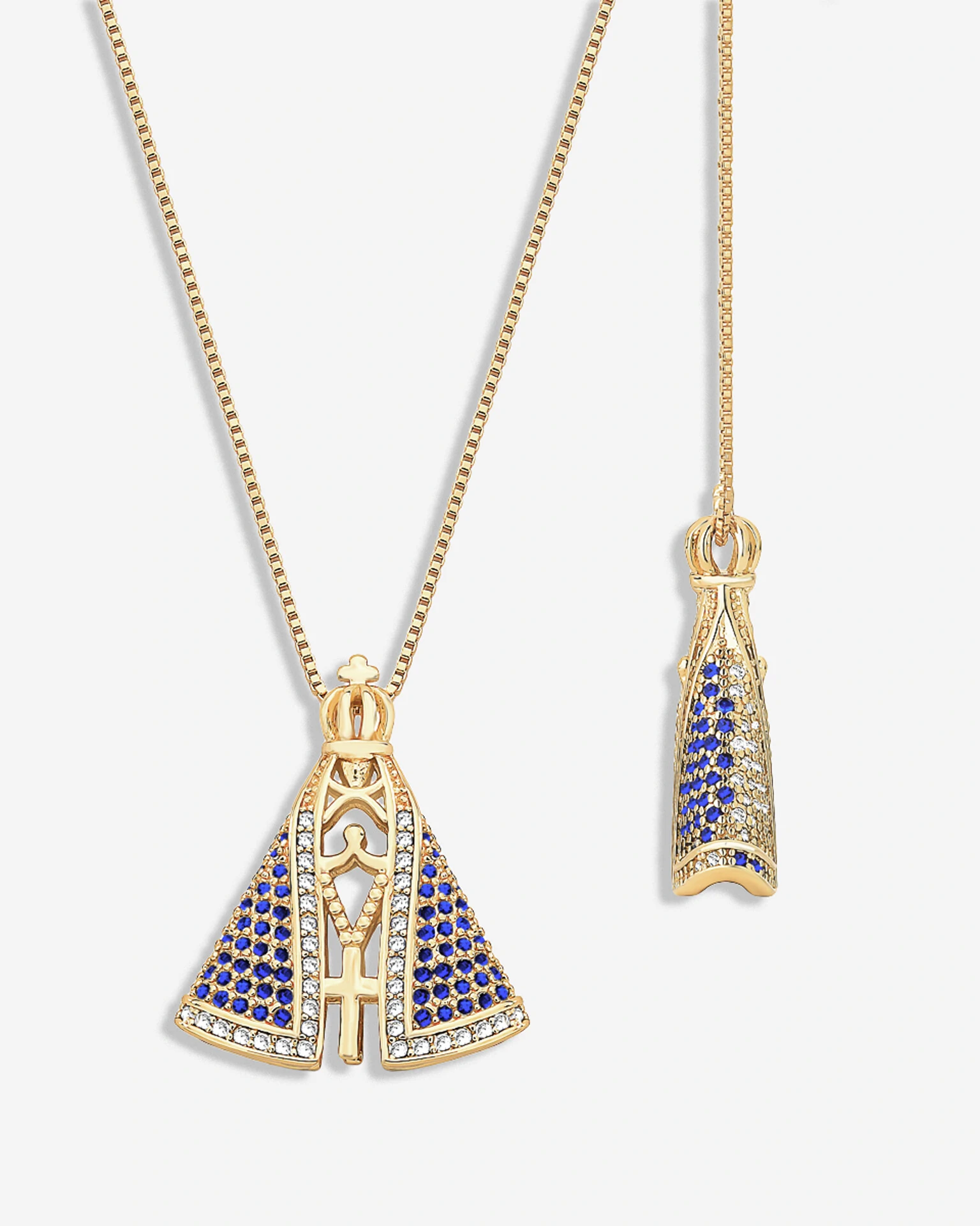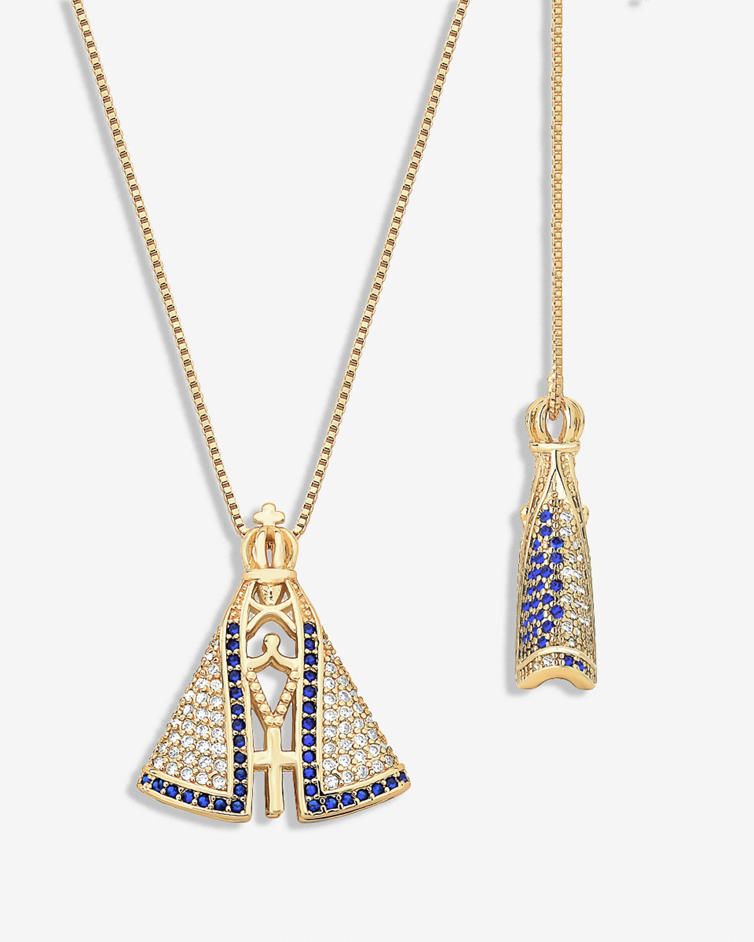 Delicada corrente veneziana, com a Nossa Senhora Aparecida em dupla face. De um lado o manto branco com os detalhes em azul, do outro o manto é azul com os detalhes em branco. Uma jóia versátil, delicada perfeita para quem busca unir fé, elegância e brilho em uma única peça.