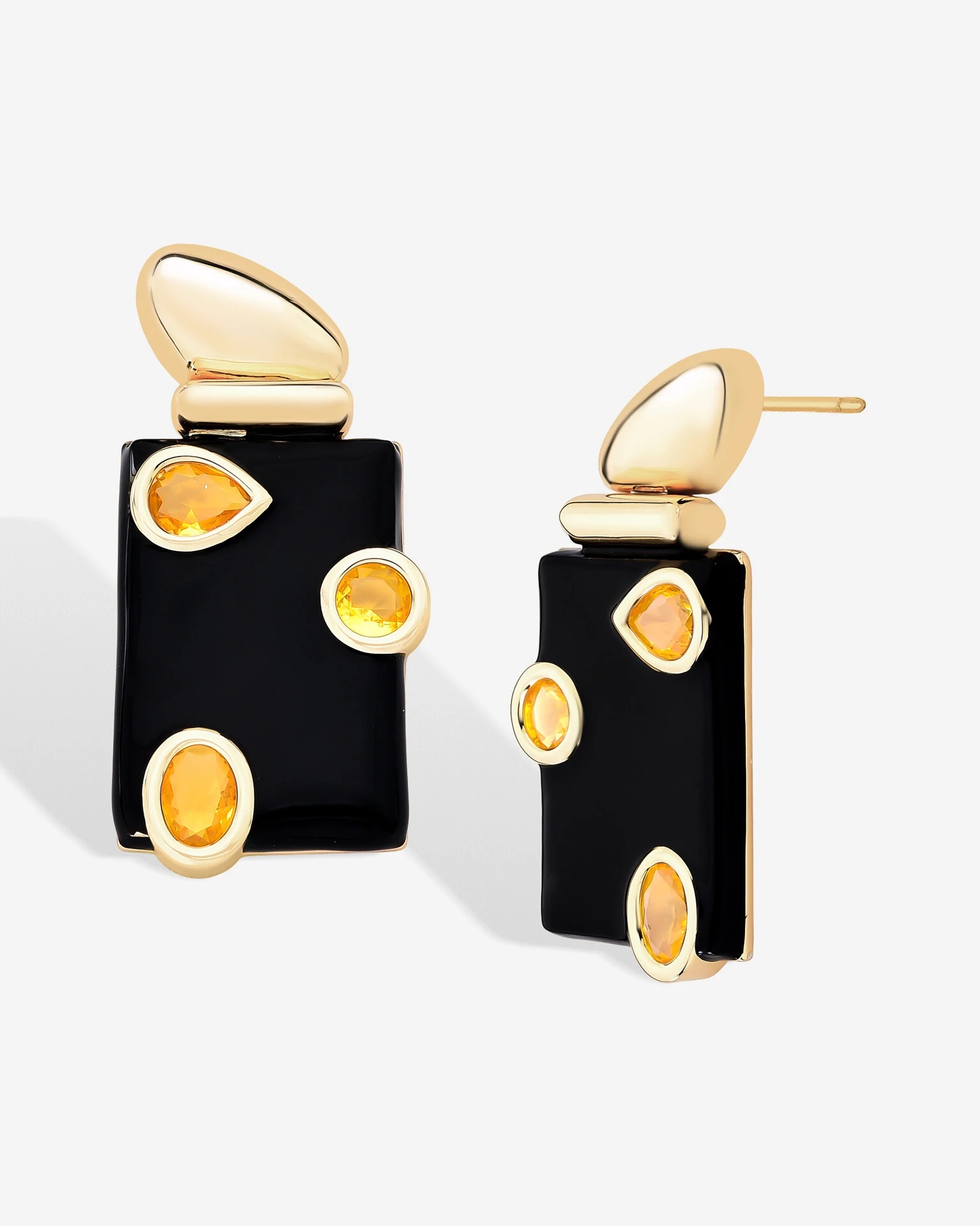O Brinco Noir Lux, traz o design geométrico acabamento sofisticado. Com contraste entre a resina preta e o brilho das zircônias citrino cria uma joia moderna, em banho de ouro 18k perfeita para quem busca elegância com um toque artístico