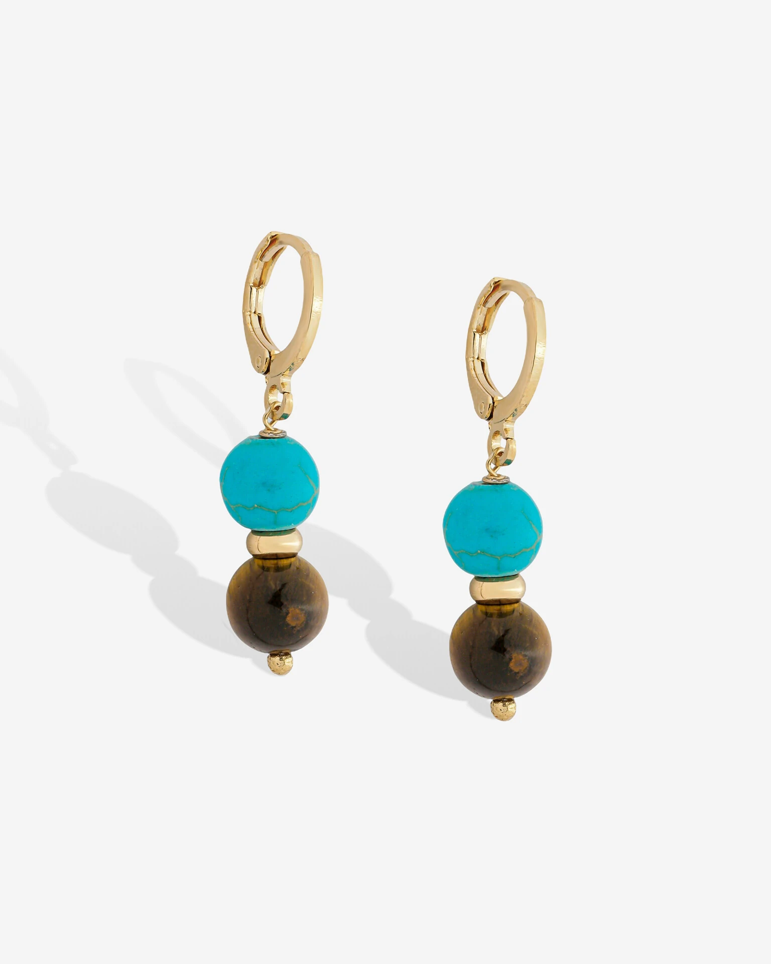 A delicada junção da pedra Turquesa Howlita com a pedra Olho de Tigre apresenta uma composição repleta de harmonia e encanto. Disponível em banho de ouro 18k.