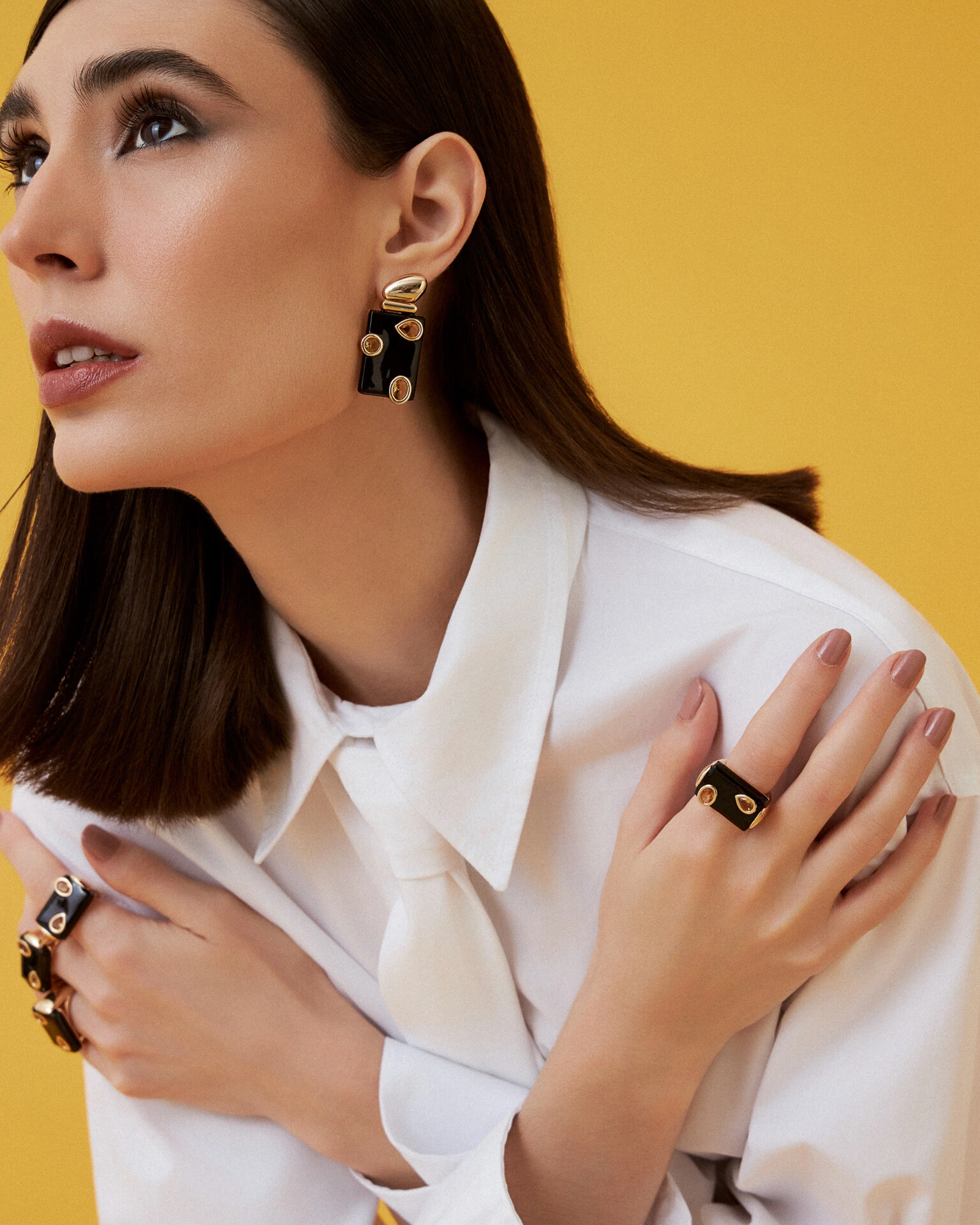 O Anel Noir Lux, traz o design geométrico acabamento sofisticado. Com contraste entre a resina preta e o brilho das zircônias citrino cria uma joia moderna, em banho de ouro 18k perfeita para quem busca elegância com um toque artístico
