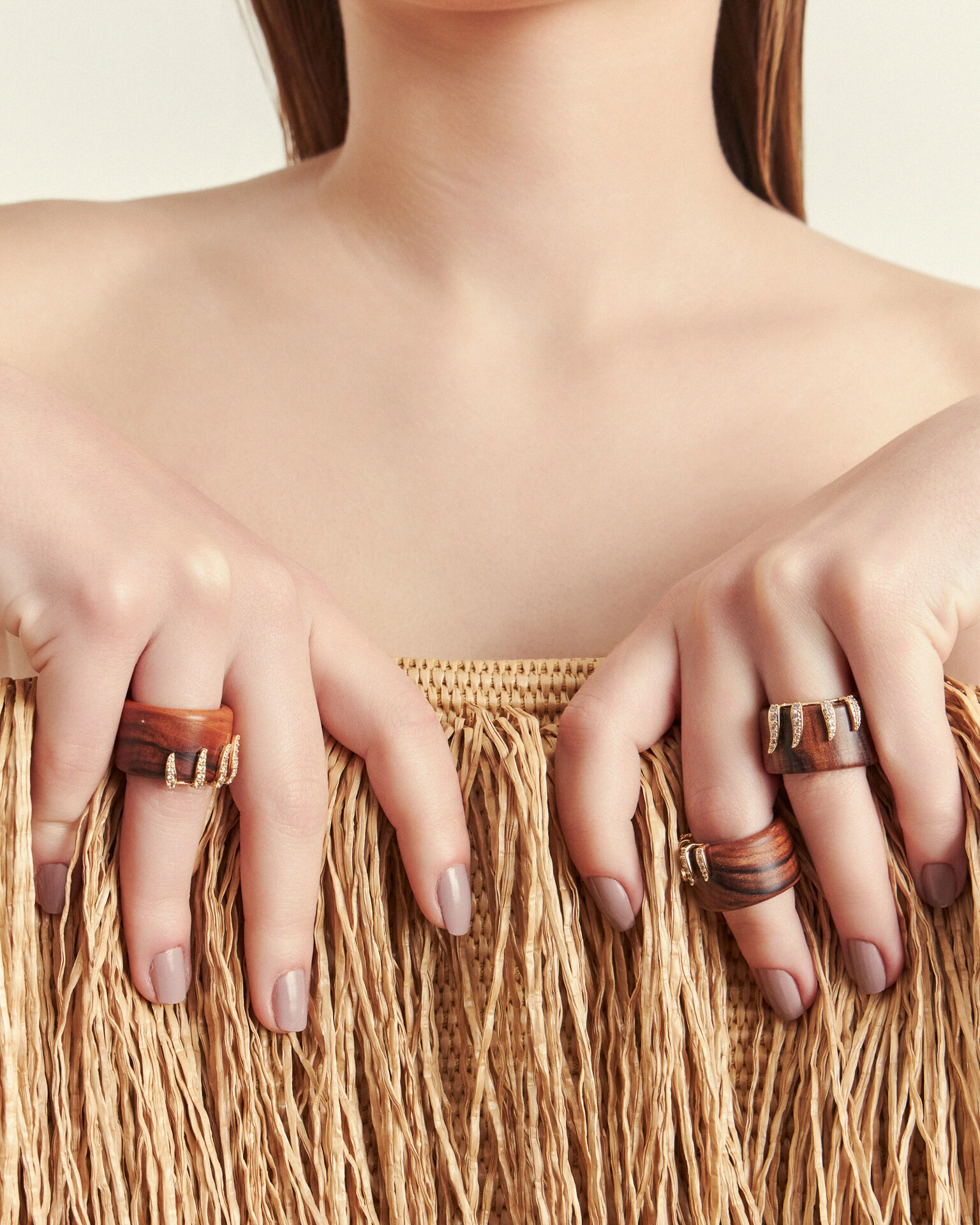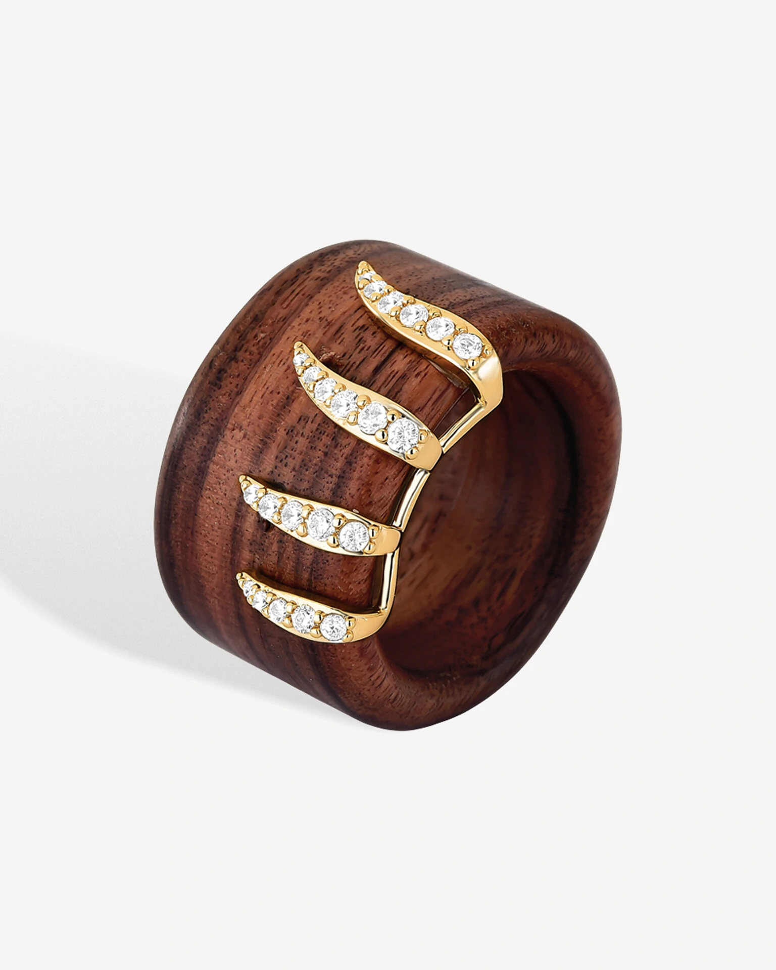 Confeccionado em madeira nobre Jacarandá, o Anel Woods, apresenta um design contemporâneo de linhas suaves, onde o brilho e a sofisticação são fornecidas por hastes que recebem a cravação de zircônias nos tons de Cristal.