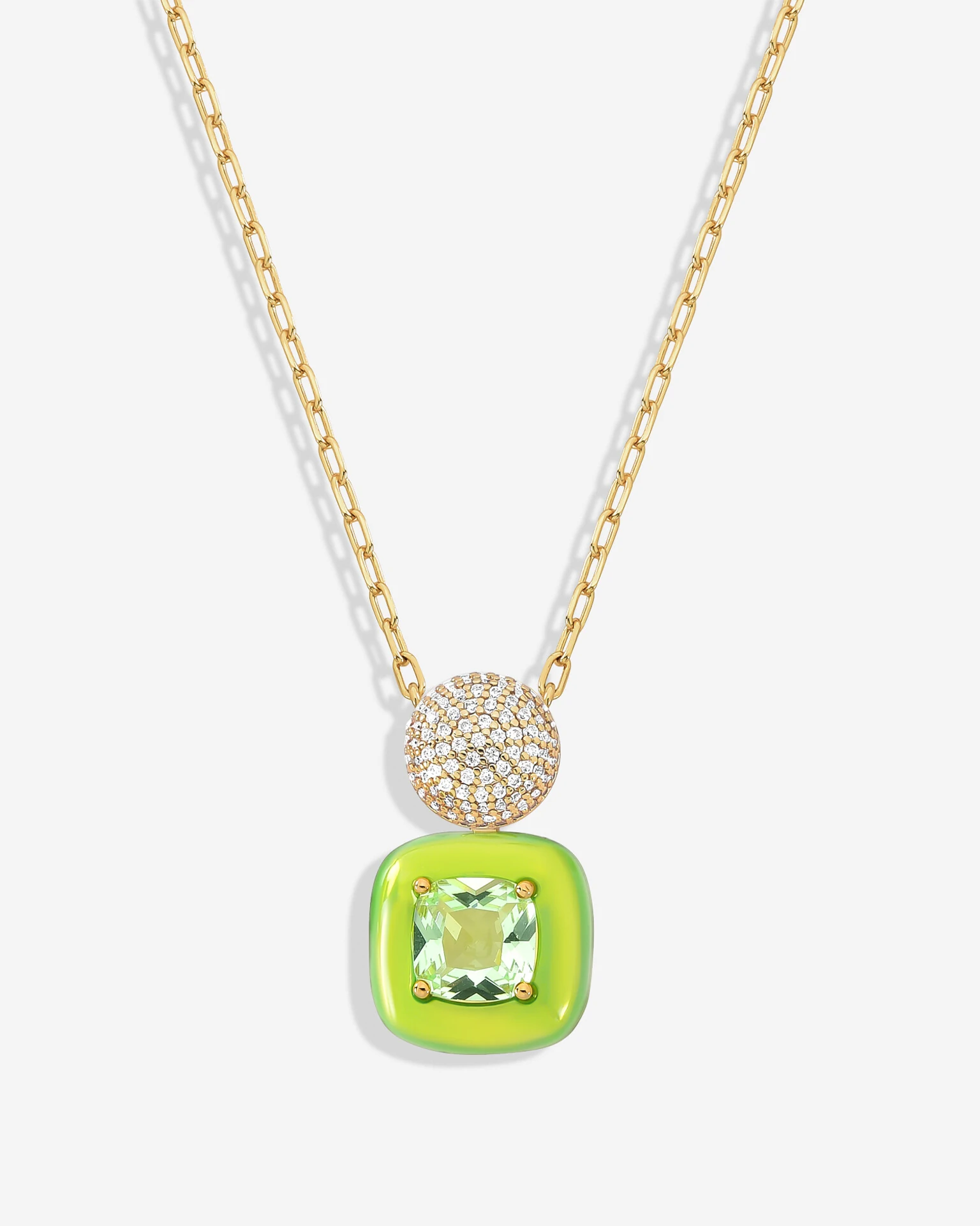 O Colar Lime Glow apresenta uma fusão audaciosa de tonalidades vibrantes criando um acessório super estiloso e repleto de detalhes que sintetizam sua elegância. A corrente de elos alongados é perfeita para destacar a beleza da esfera em Pavê de Zircônias Cristais, criamndo um contraste vivaz com a moldura quadrada em Neon Limão e sua impactante Zircônia Peridoto. Detalhes que imprimem frescor em uma refinada e chamativa estética contemporânea.
