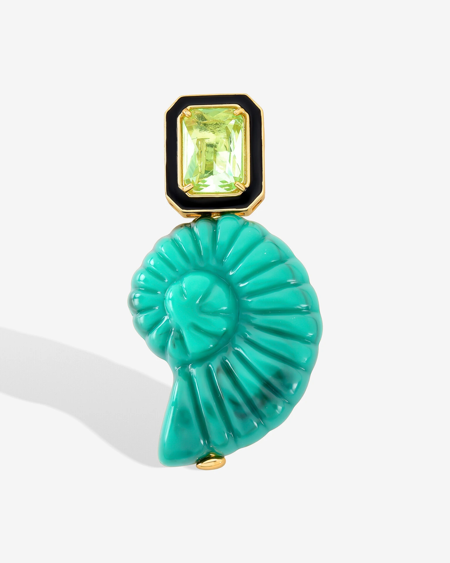 O Pingente Salinas destaca-se pelo contraste sofisticado: no topo, uma Zirconia envolta por uma moldura geométrica preta e dourada que remete ao glamour do Art Deco. Abaixo, a peça se expande em uma imponente concha esculpida em tons vibrantes, trazendo movimento e frescor ao design.