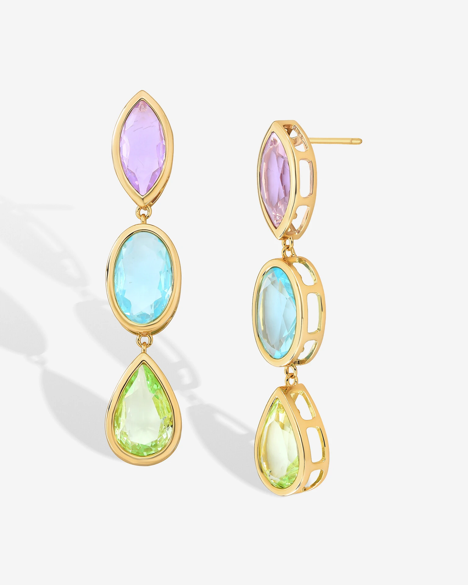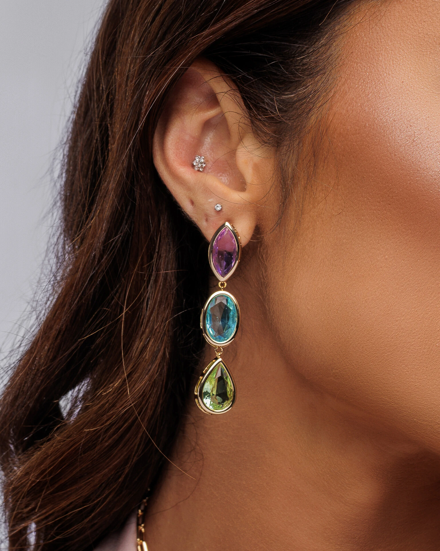 O encantador Brinco Drop Colors combina a elegância clássica da estrutura em banho de Ouro18k com a vibração sutil das 'candy colors'. O design apresenta 3 pingentes fixos com lapidações exclusivas — alternando entre formas ovais, gotas e navetes — em tons de lilás, menta e azul-céu.