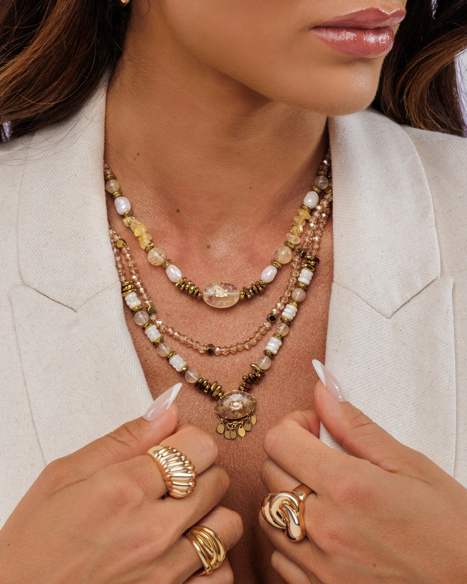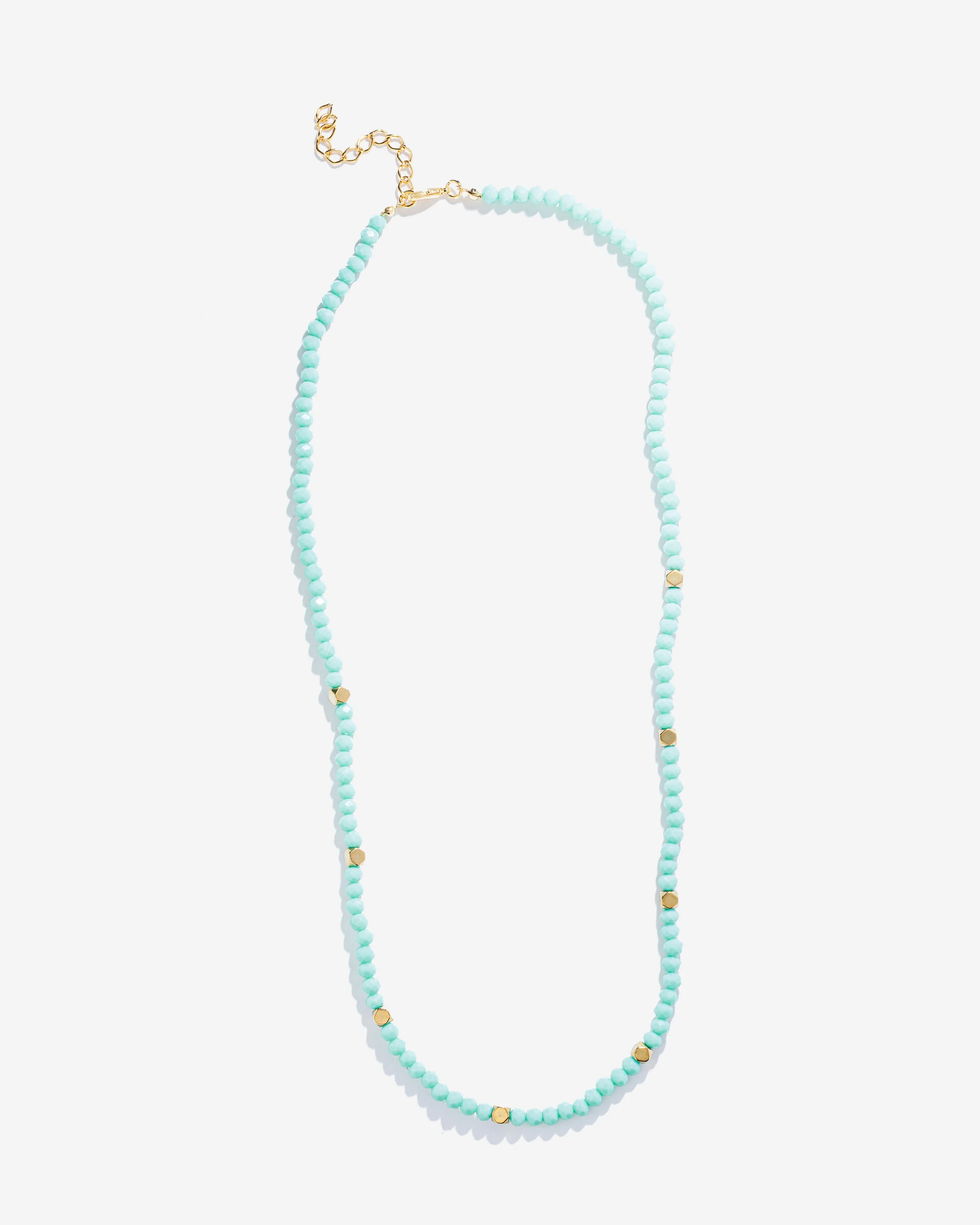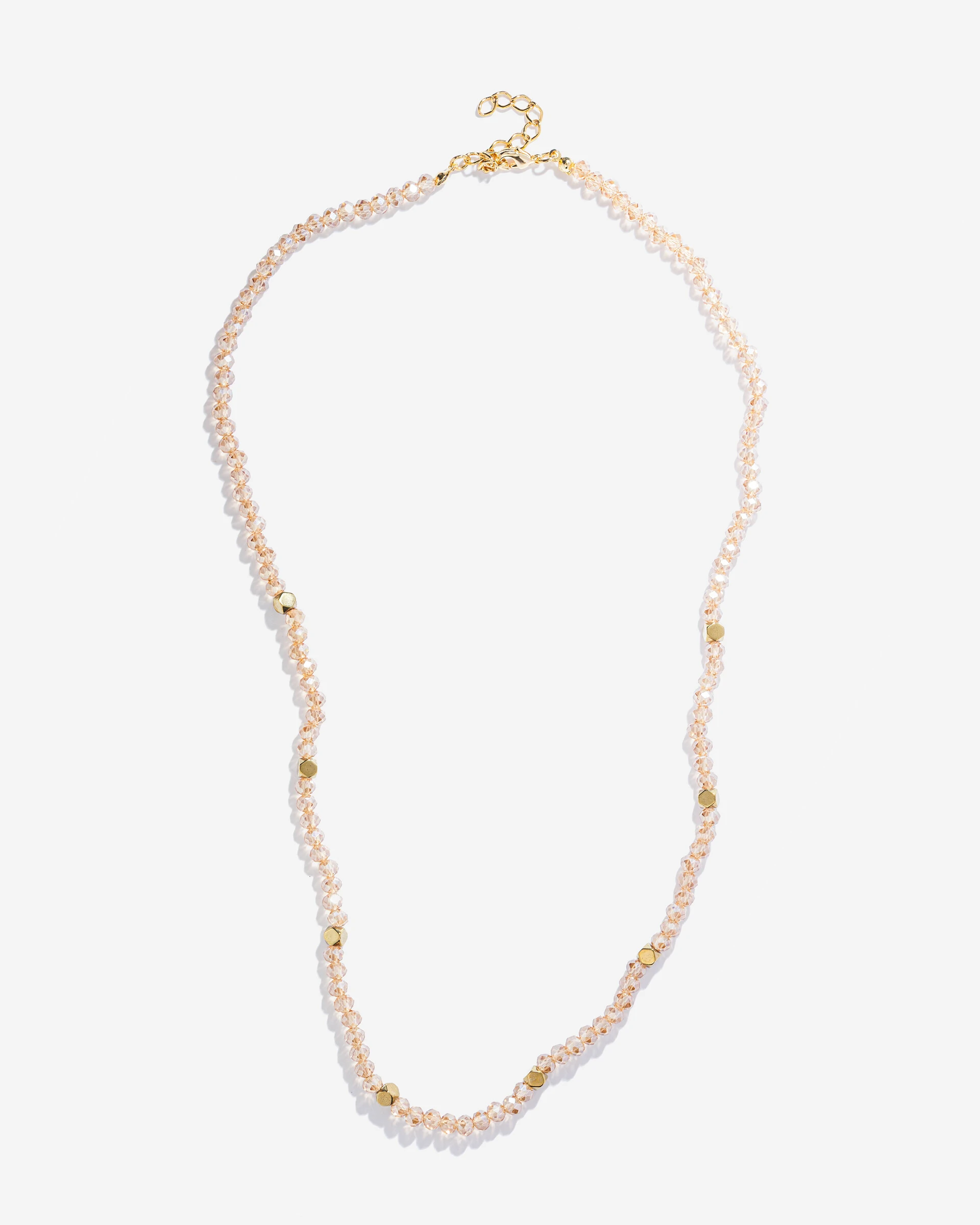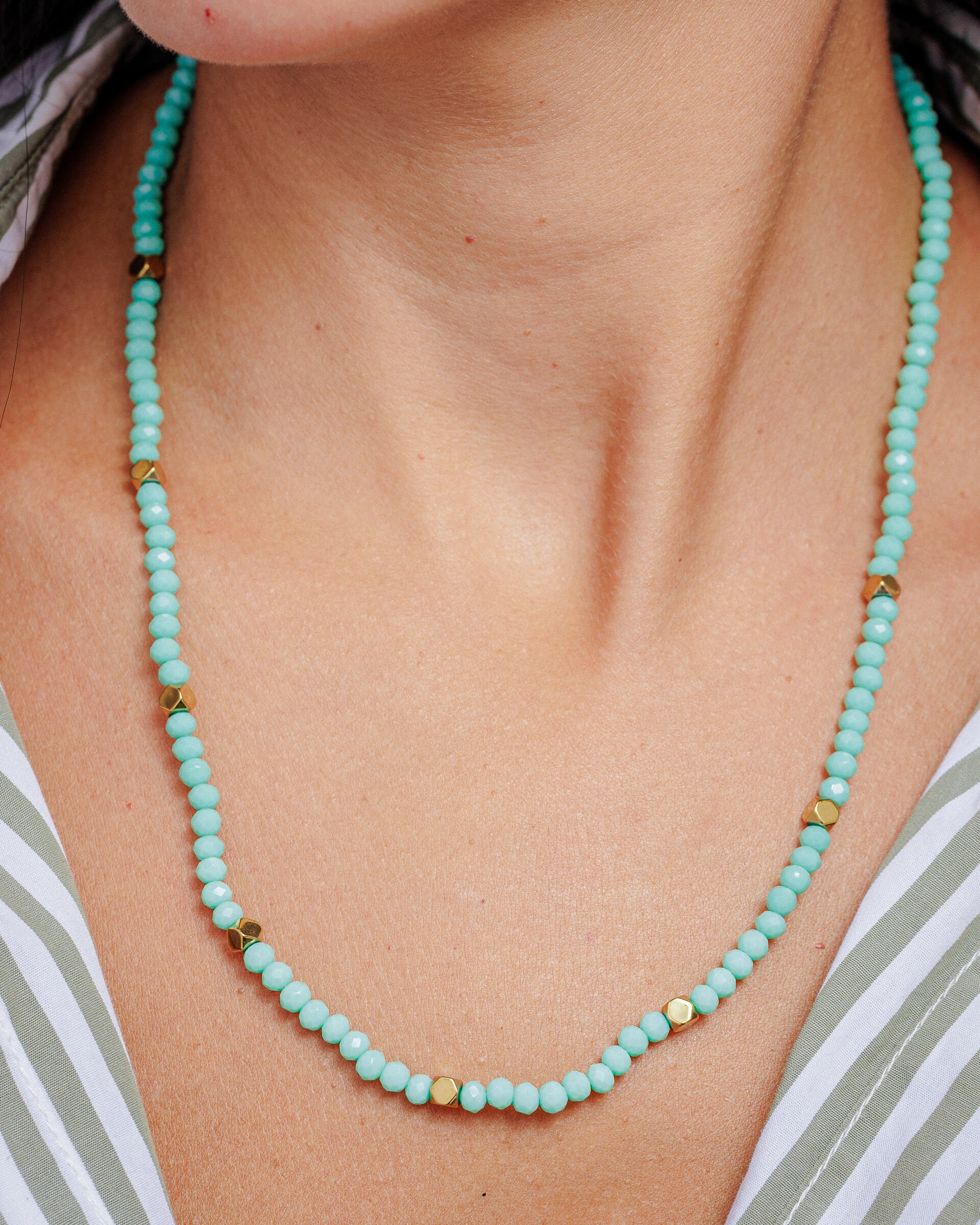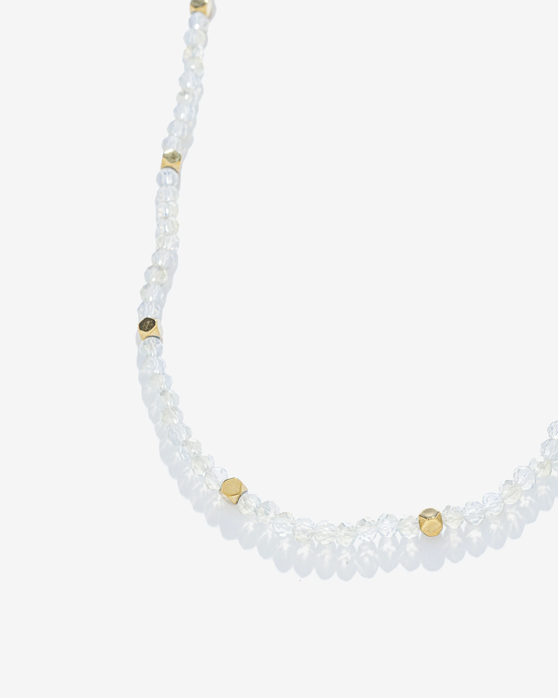 Colar Beads France, um colar delicado, feito com cristais búlgaros. Ao longo de sua extensão, ele é adornado com pequenos detalhes em formato de hexagodos dourados e lisos. Uma peça delicada e versátil, este colar pode ser usado de várias maneiras para complementar diferentes estilos e ocasiões.