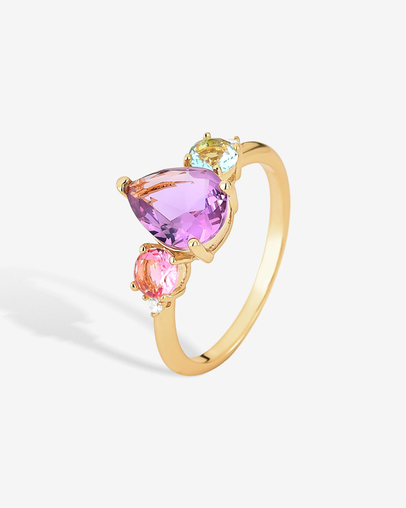 O Anel Gota Coloré, carrega o charme pelo detalhe da zircônia central lapidação Gota e nas laterais Pontos de Luz, nas cores, Água Marinha, Citrino, Pink e Tanzanita, trazendo brilho e cores para a peça. A combinação perfeita entre brilho quente e delicadeza