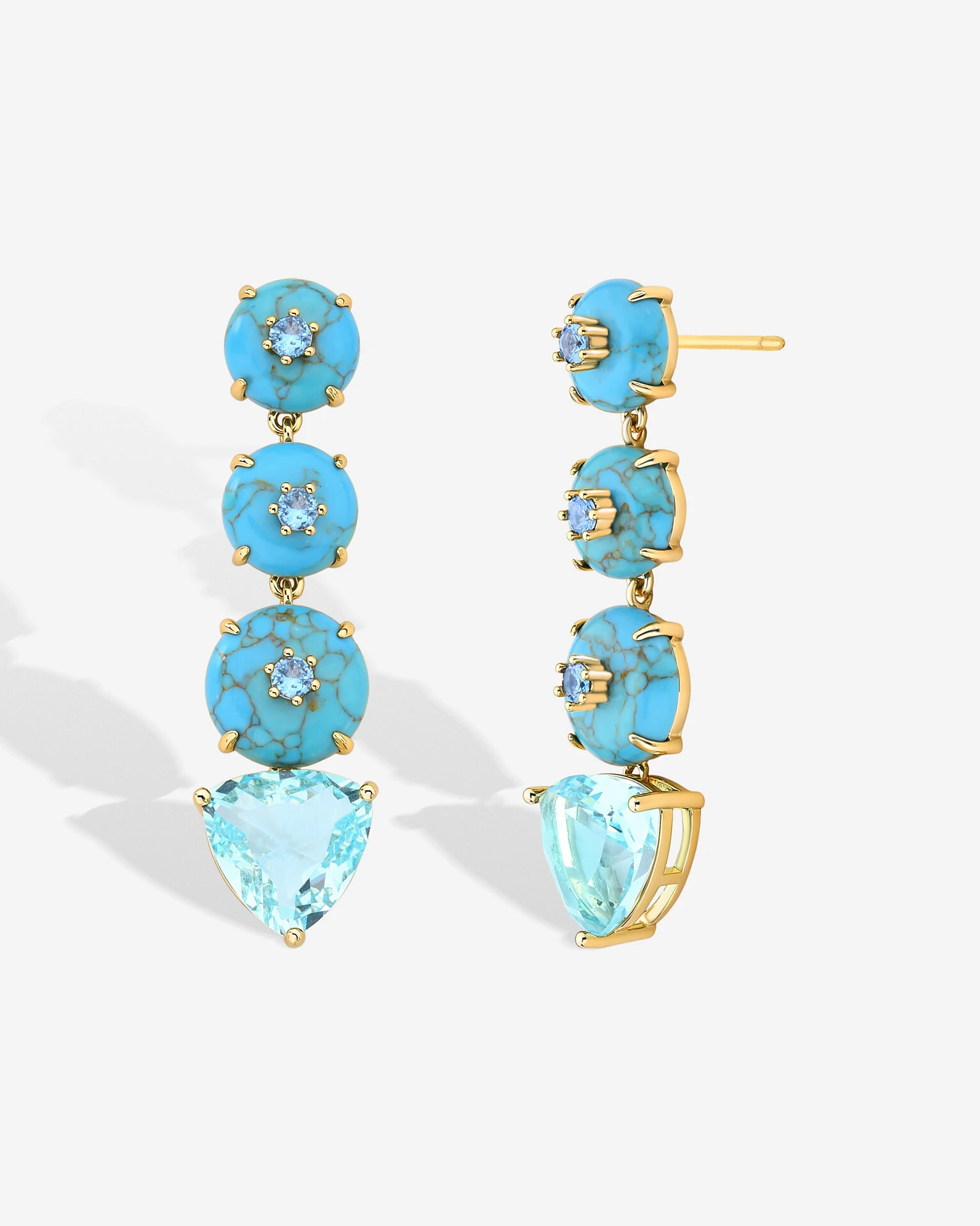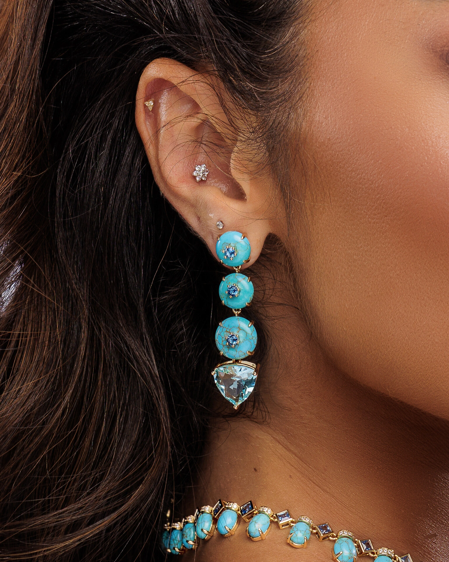 A impactante beleza do Brinco Oásis Marine se deve as maravilhosas nuances de azul, que recobrem delicadas formas geométricas com zircônias no tom água marinha, ou na imponente Turquesa Reconstituida, arrematadas por pequenos pontos de luz que conferem um must de refinamento ao conjunto.