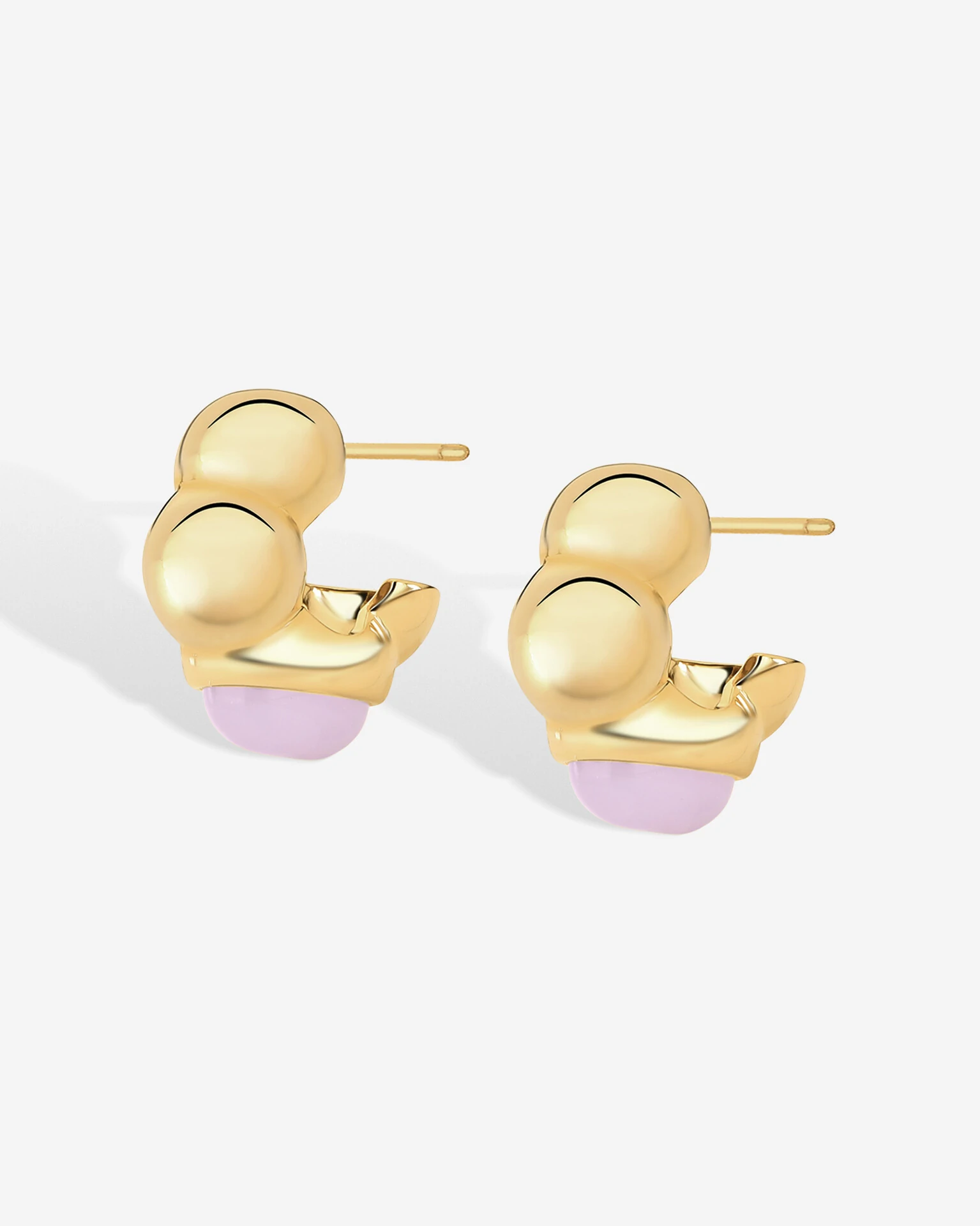 Brinco Meia Argola Antonia, aro feito por gomos abaloados com microcravação de zircônia cristal, e cravada com com pedra Quartzo Rosa. Diponível em banho de ouro 18k.