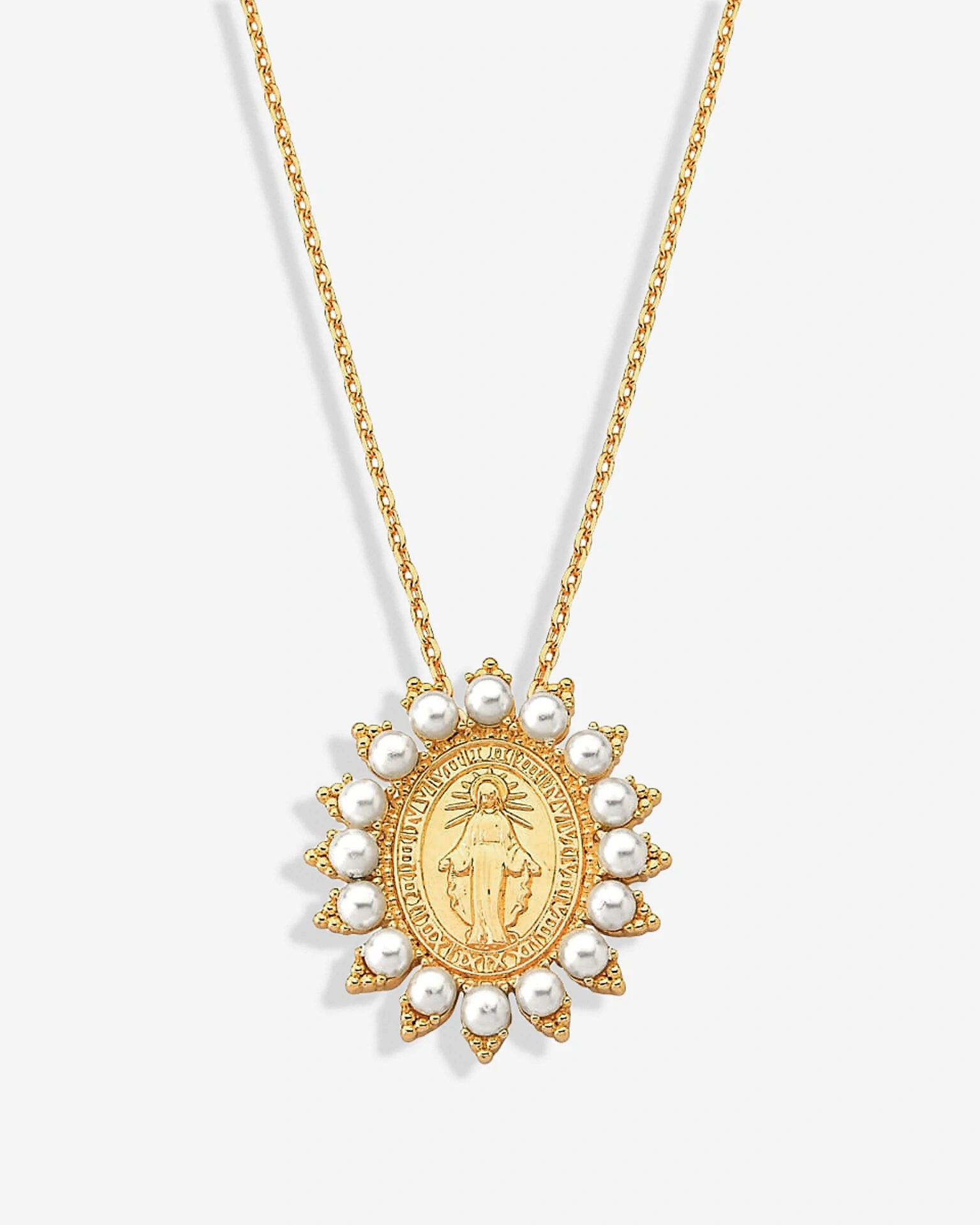 A força espiritual representada no maravilhoso medalhão com a figura de Nossa Senhora das Graças, destaca em sua bela moldura, o brilho elegante e nacarado de pequenas pérolas Shell, reforçando o poder milagroso deste acessório. Disponível em banho de ouro 18k.