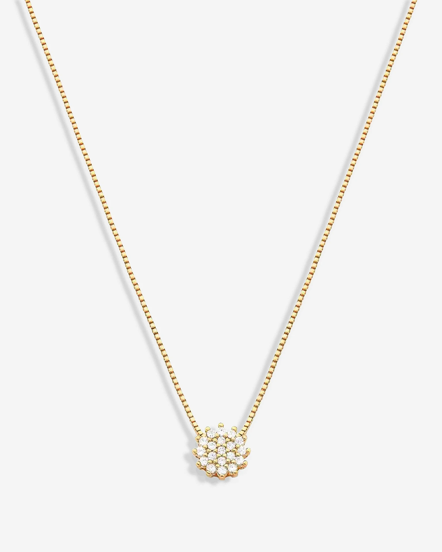 A força do brilho refinado de zircônias cristais se espalham por todo o pequeno pingente circular, recriando o brilho do sol que irá proporcionar muito mais beleza aos seus looks do a dia. Modelo com corrente Veneziana, disponível em banho de ouro 18k.