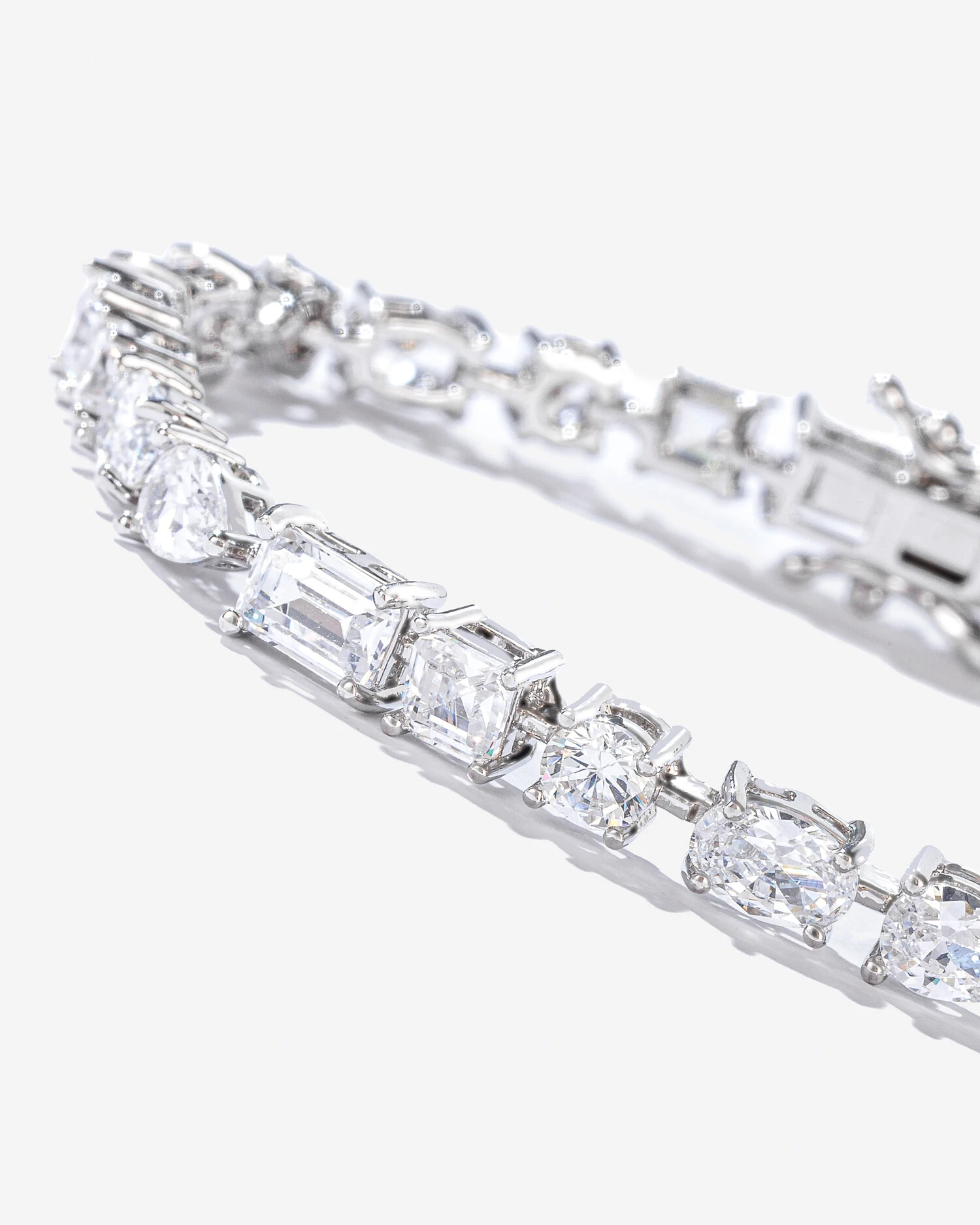 A corrente fio faca valoriza individualmente a beleza de zircônias cristais, em diferentes tipos de lapidações, que se sucedem na elegante Pulseira Riviera Clear, criando reflexos intensos e cristalinos que a transformam em um modelo de extrema elegância.