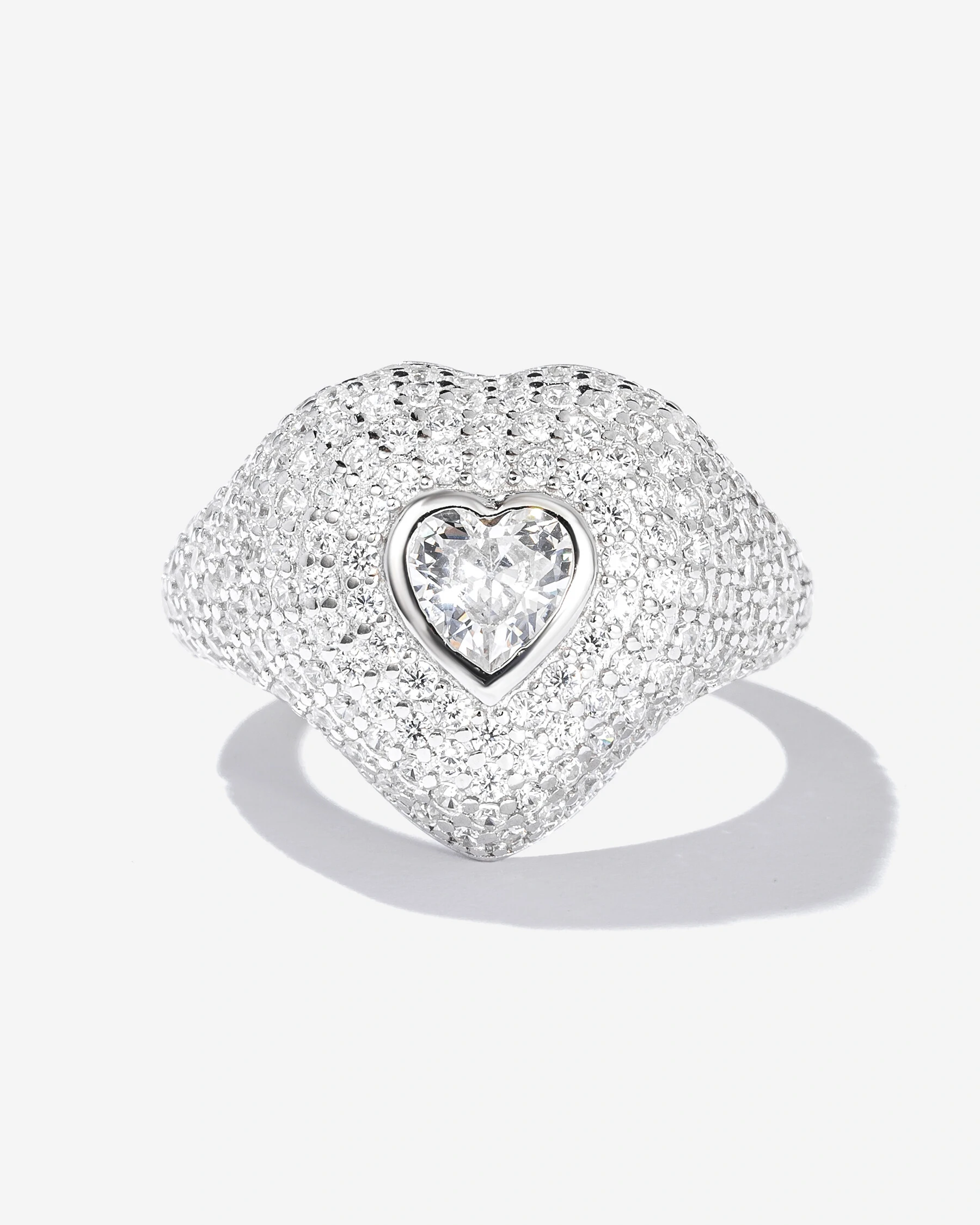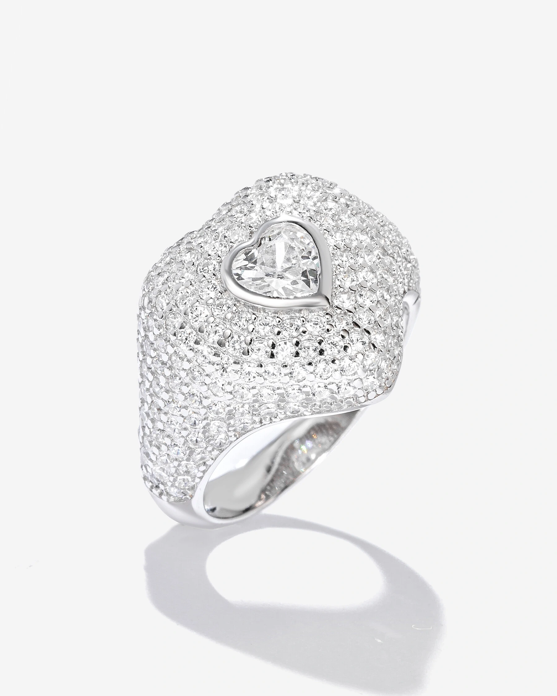 A sofisticação do volumoso Anel Ravi, elegante joia em prata 925 com banho de ródio branco, se deve à maravilhosa composição de zircônias cristais presentes no Pavê de seu aro abaulado e no pequeno coração centralizado em seu topo.