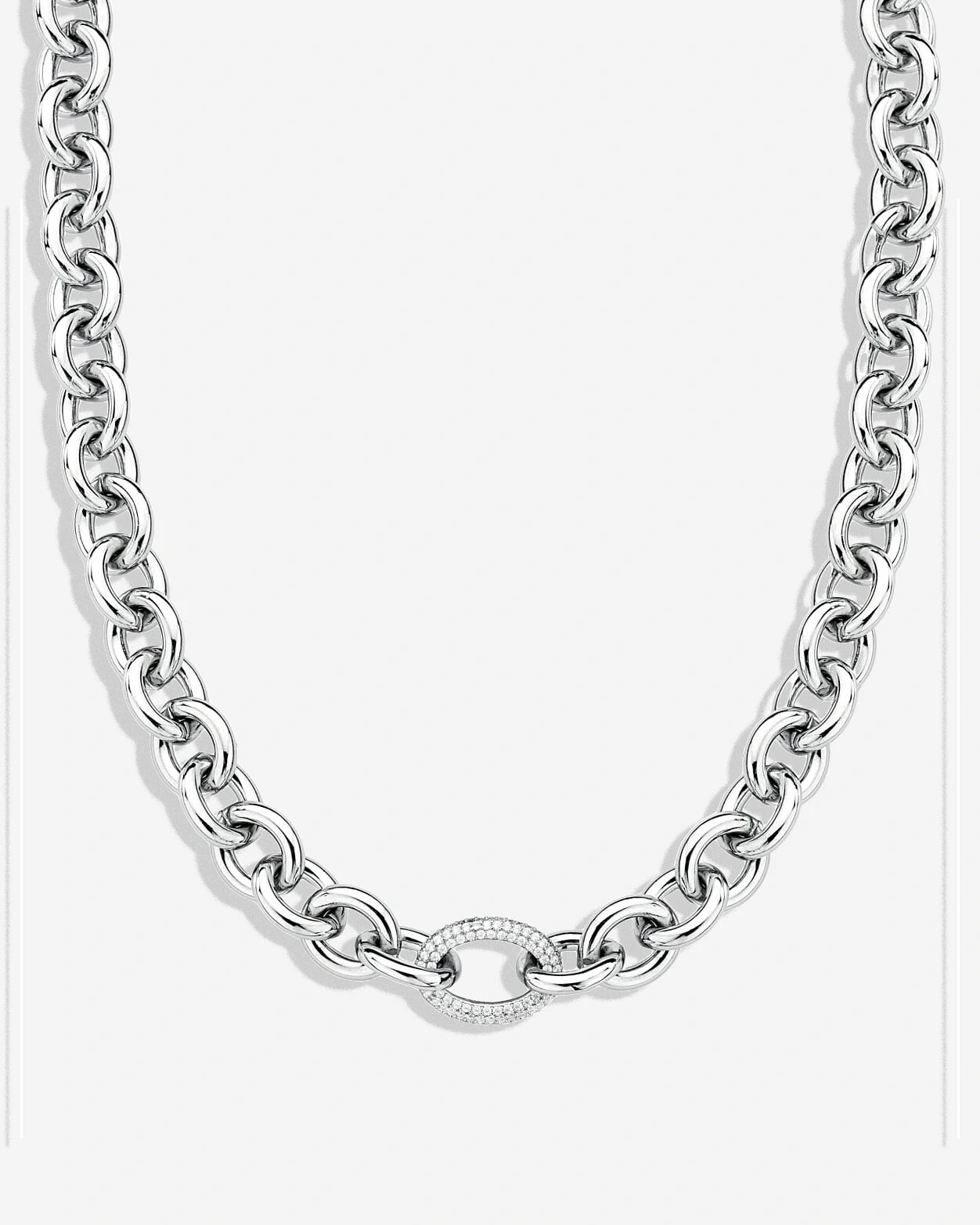 A volumosa corrente de elos Português do Colar Jheny, apresenta um elegante elo ovalado recoberto por zircônias Cristais, um detalhe sutilmente refinado que traz brilho e charme ao acessório. Disponível em banho de ouro 18k e ródio branco.