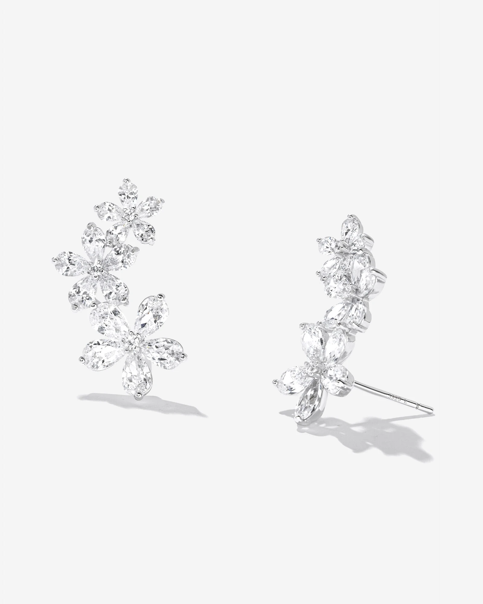 A elegância atemporal deste modelo de Ear Cuff, confeccionado em prata 925 com banho de ródio branco, se deve à maravilhosa composição decrescente formada por três pequenas flores em zircônias cristais, criando um visual clean e refinadamente charmoso.