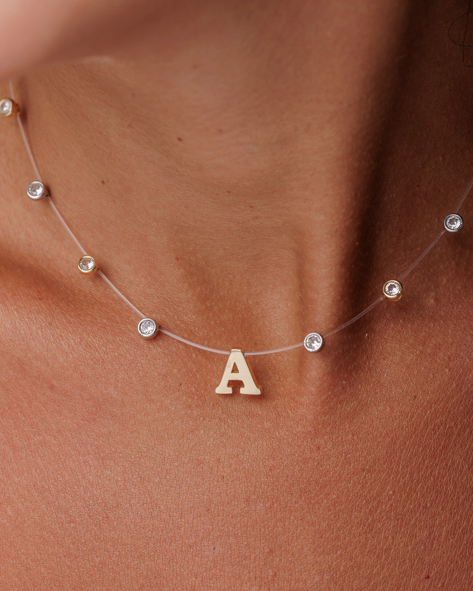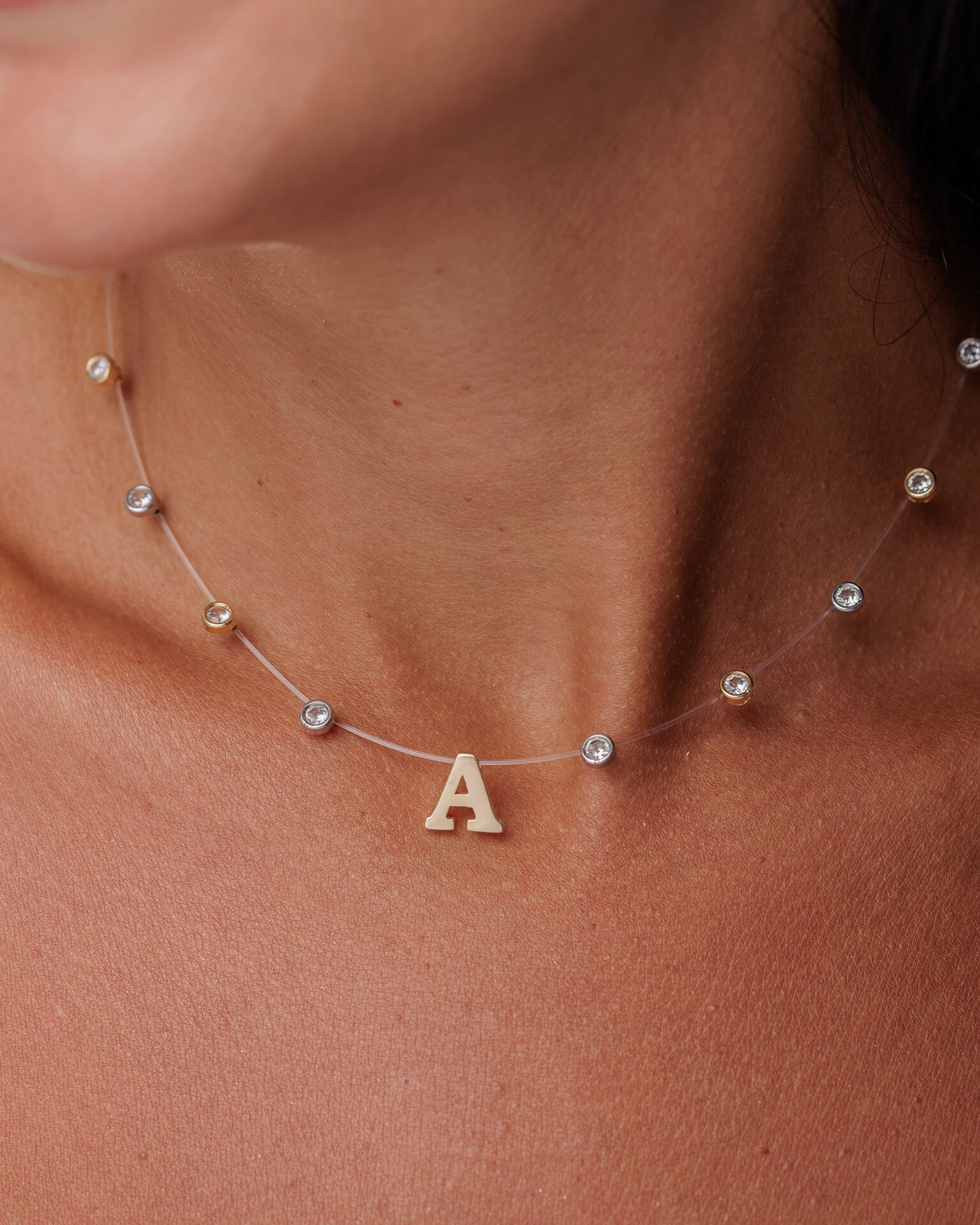 Seu design minimalista com poucos elementos, permite que a corrente de fio de invisível destaque a beleza atemporal dos pontos de luz em cravação inglesa, intercalados entre o banho de Ouro 18k, em seu centro possui pingente com Inicial de sua preferência proporcionando um toque artístico e de refinada imperfeição.