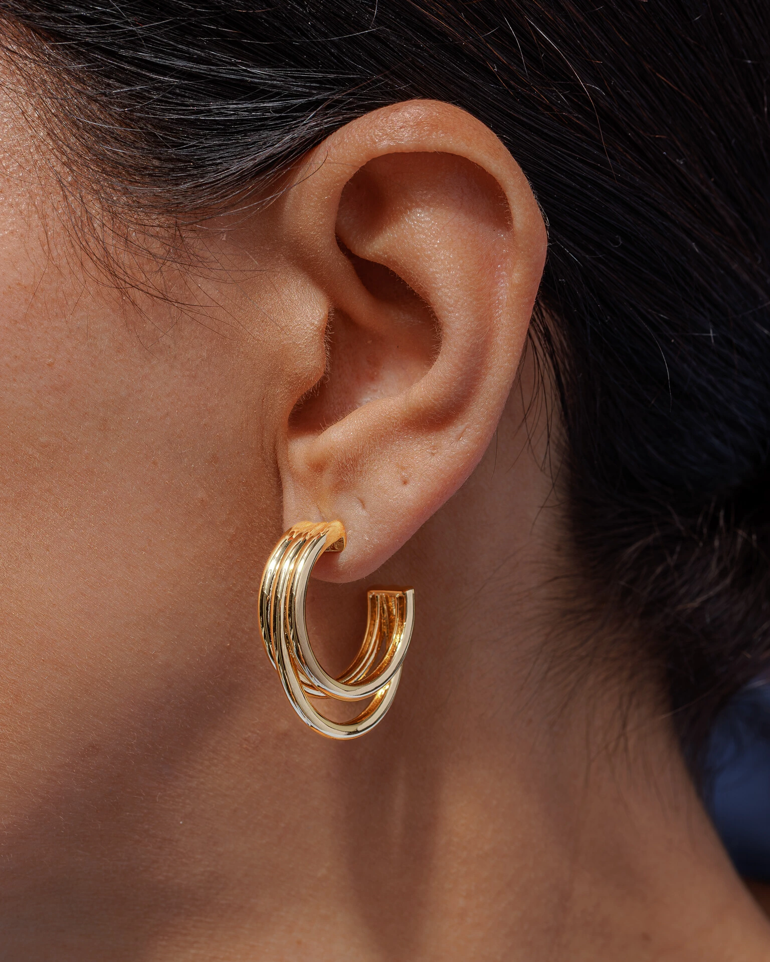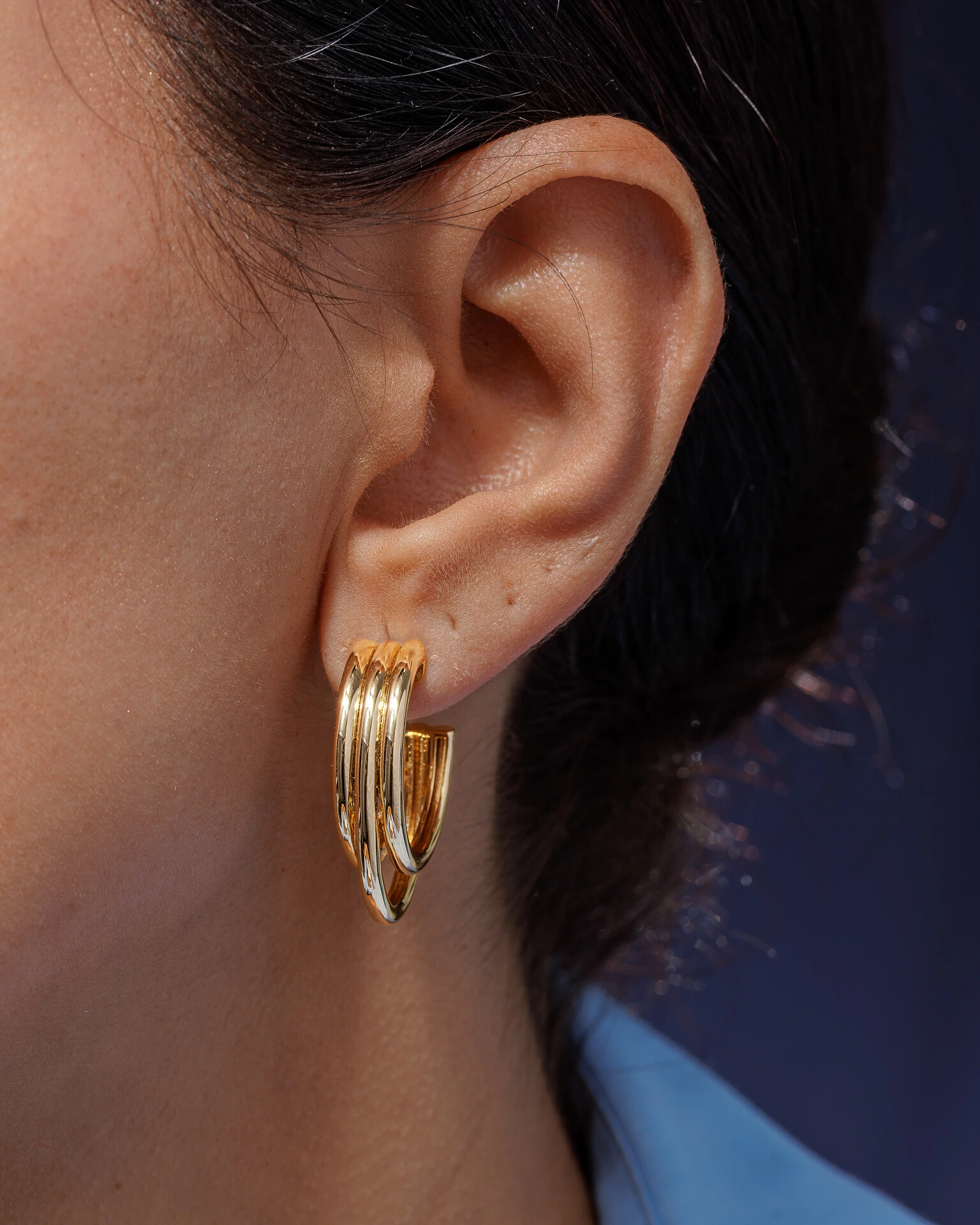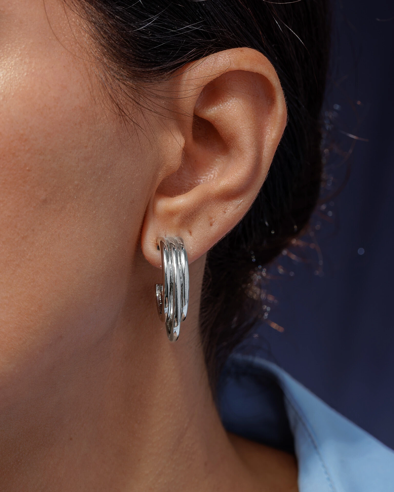 Brinco volumoso com semi aros assimétricos. Disponível em banho de Ouro 18k e Ródio Branco.
