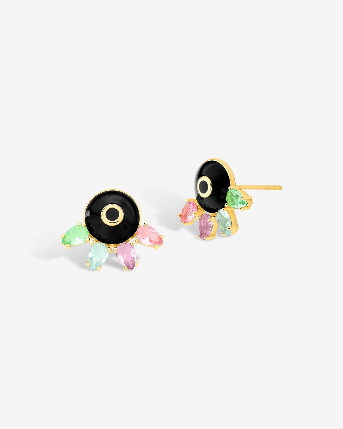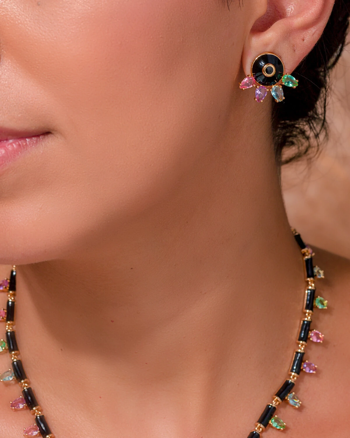 Brinco volumoso com esfera em esmaltação italiana na cor preta com cravação em Zircônias Colors na lapidação gota.
