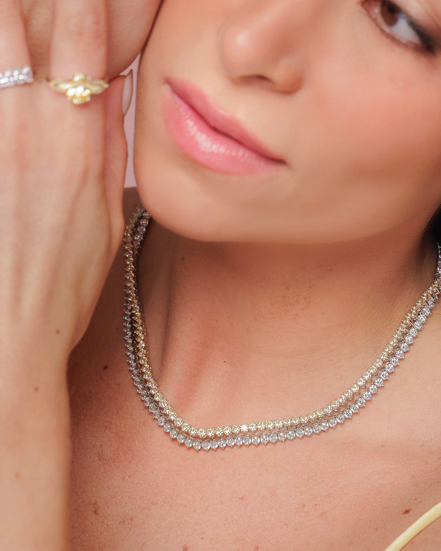 Colar com pedrarias, em banho de Ródio Branco e Ouro 18k, com cravação de Zircônias Cristais 3mm. Possui fecho gaveta e trava de segurança. Sua estrutura tem a trama rígida, portanto não vira, exatamente igual a Riviera da alta joalheria.