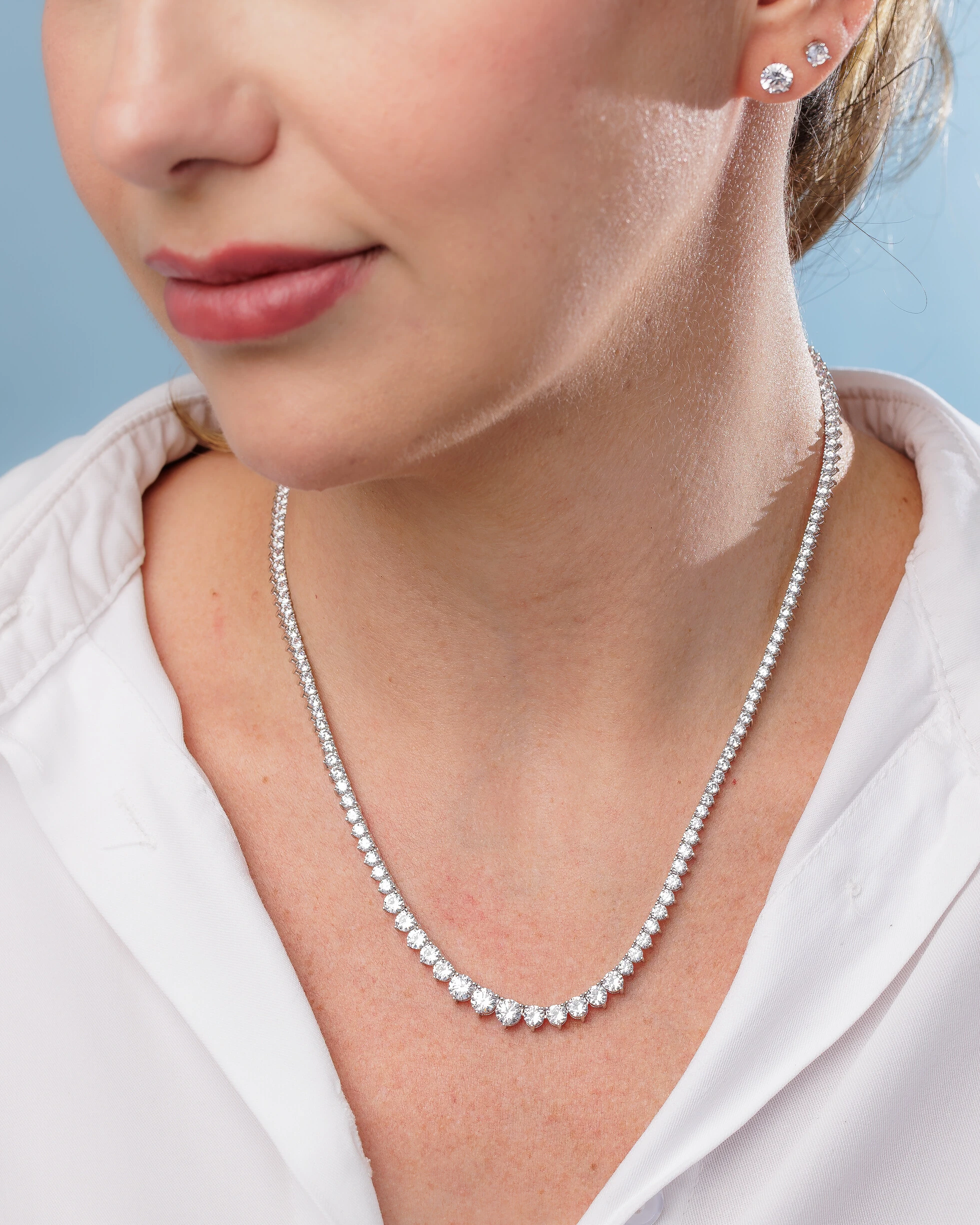 A maravilhosa Riviera Paris, com corrente de estrutura de trama rígida que não lhe deixa virar, transmite a elegância de zircônias cristais em uma composição decrescente, sua cravação de 3 garras está disposta para que os cristais pareçam delicados corações repletos de luz. Sua beleza é uma ode em alusão ao brilho mágico das luzes que se desprende cada noite da romântica Cidade Luz.