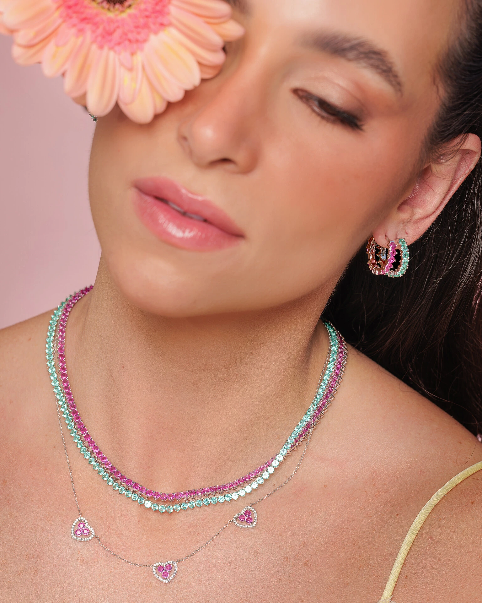 Colar Riviera, em banho de Ródio Branco, com cravação de Zircônias na lapidação Brilhante. Sua estrutura tem a trama rígida, portanto não vira, exatamente igual a Riviera da alta joalheria.