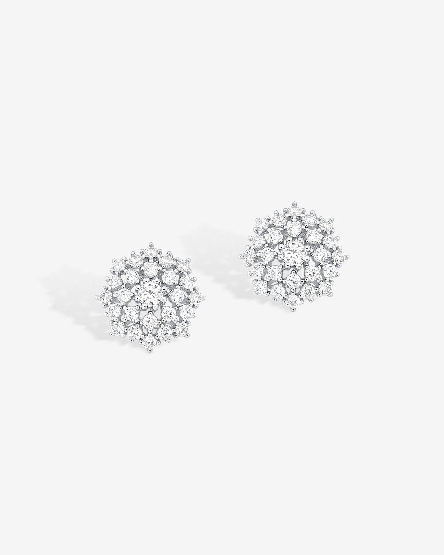 Brinco volumoso, modelo chuveiro em formato de flor com cravação de Zircônias Cristais. Modelo disponível em banho de Ouro 18k e Ródio Branco.