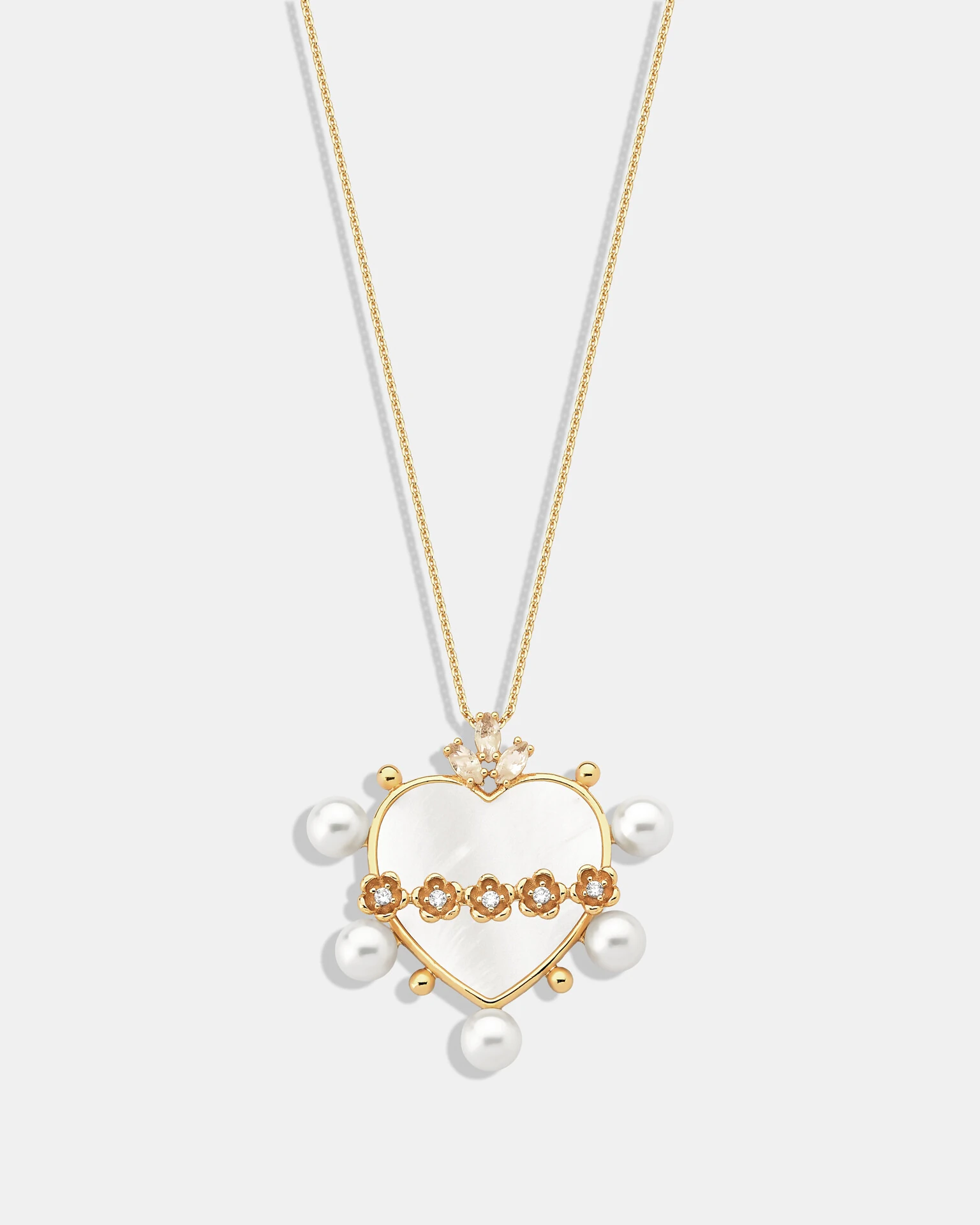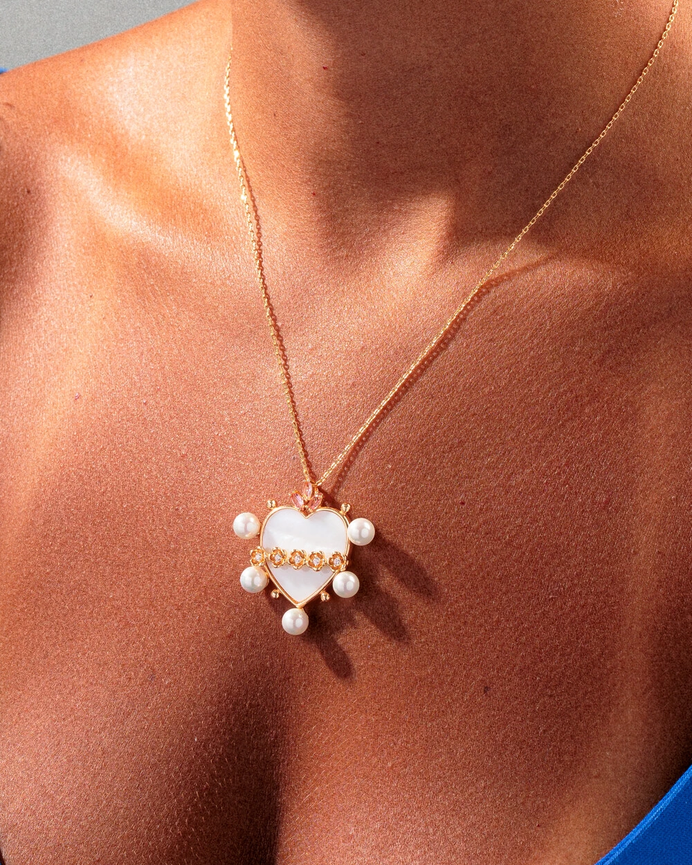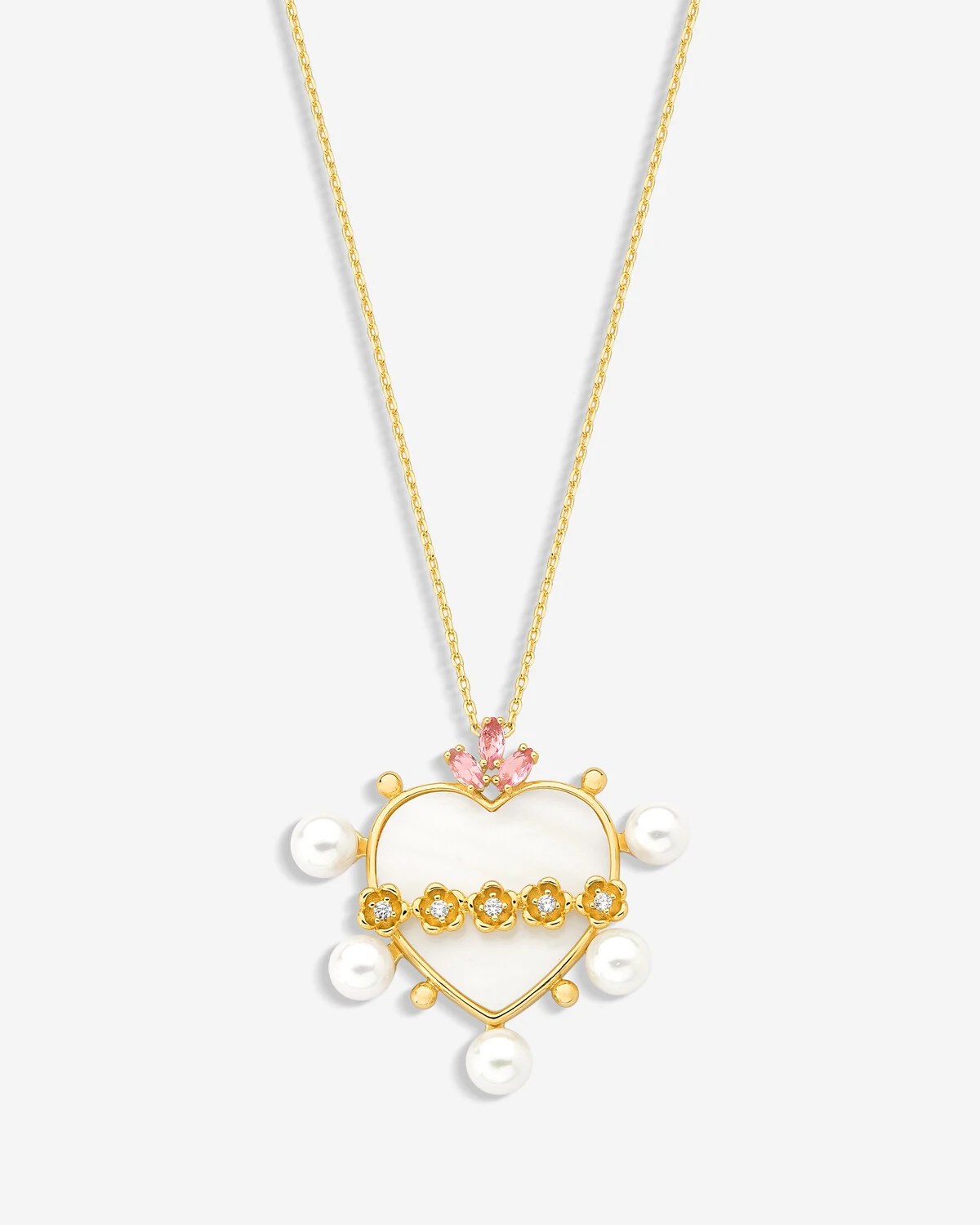Colar Sagrado Coração, em banho de Ouro 18k, com pingente de coração em Madrepérola com aplicações de Pérolas Shell, e adornos de flores com micro cravações cravações de Zircônias Cristais, e em seu topo três Zircônias Kunzitas na lapidação Navete.