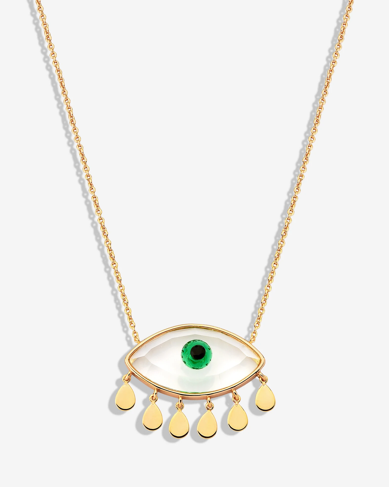 Resistir ao mistério e poder de proteção que envolve os amuletos, é difícil ainda mais diante dos detalhes do Colar Olho Grego, em banho de Ouro 18k, o pingente com uma moldura delicada de onde se desprendem cilios em formato de gotinhas, e dentro a maravilhosa pureza cristalina do olho em Cristal Búlgaro se completa com o tom vibrante da Íris em Zircônia.