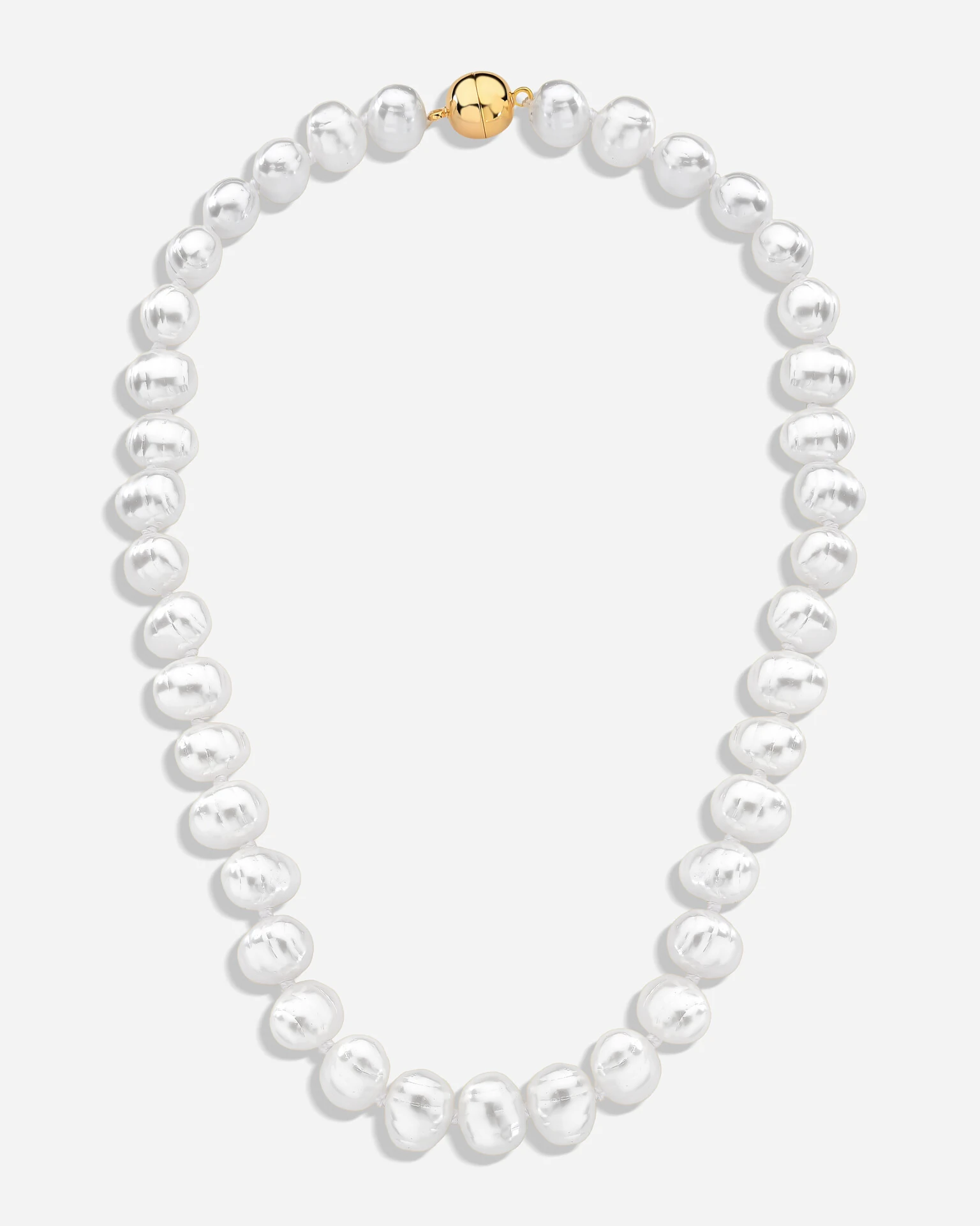 Clássicas e misteriosas as pérolas voltam em versões modernas e irreverentes, o Colar Audrey, em banho de Ouro 18k, com Maxi Pérolas Barrocas, se destaca por sua elegância maximalista. Seu fecho de imã confere ainda mais beleza ao conjunto.