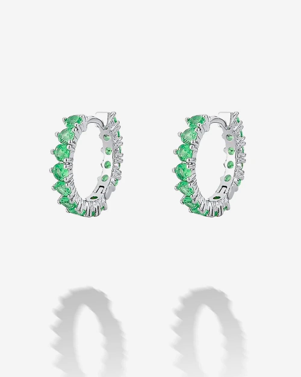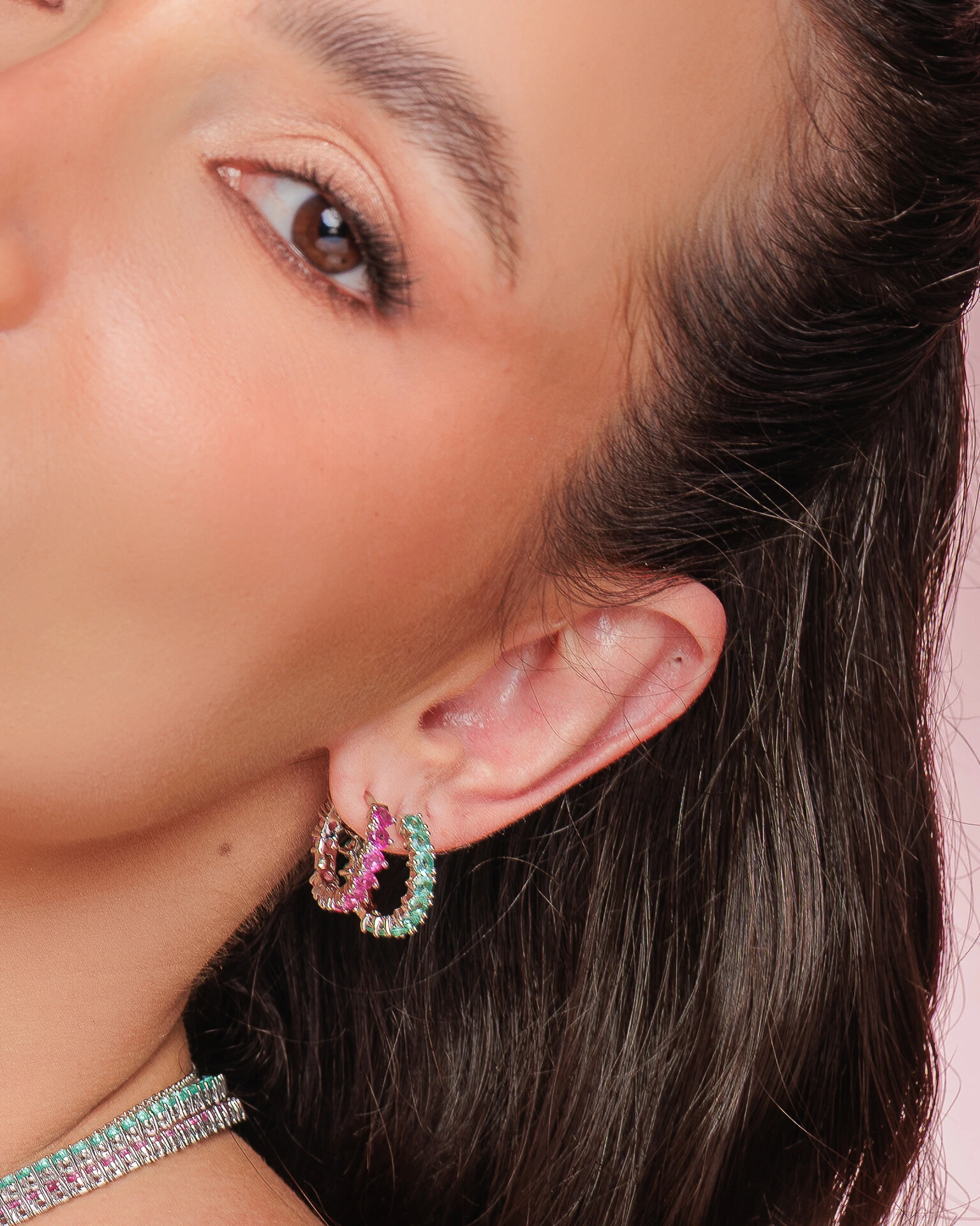 Brinco Argola delicada em banho de Ródio Branco, argola toda cravejado por 3 garras em zircônias Turmalinas e Pink, de fecho click.