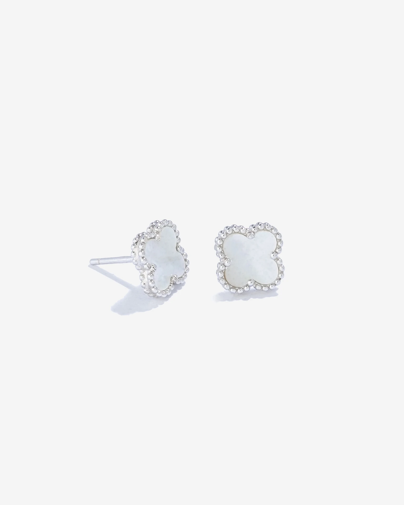 Brinco delicado, em Prata 925 e banho de Ródio Branco, no formato de Trevo Médio lapidado em Pedra Madrepérola e moldura trabalhada.