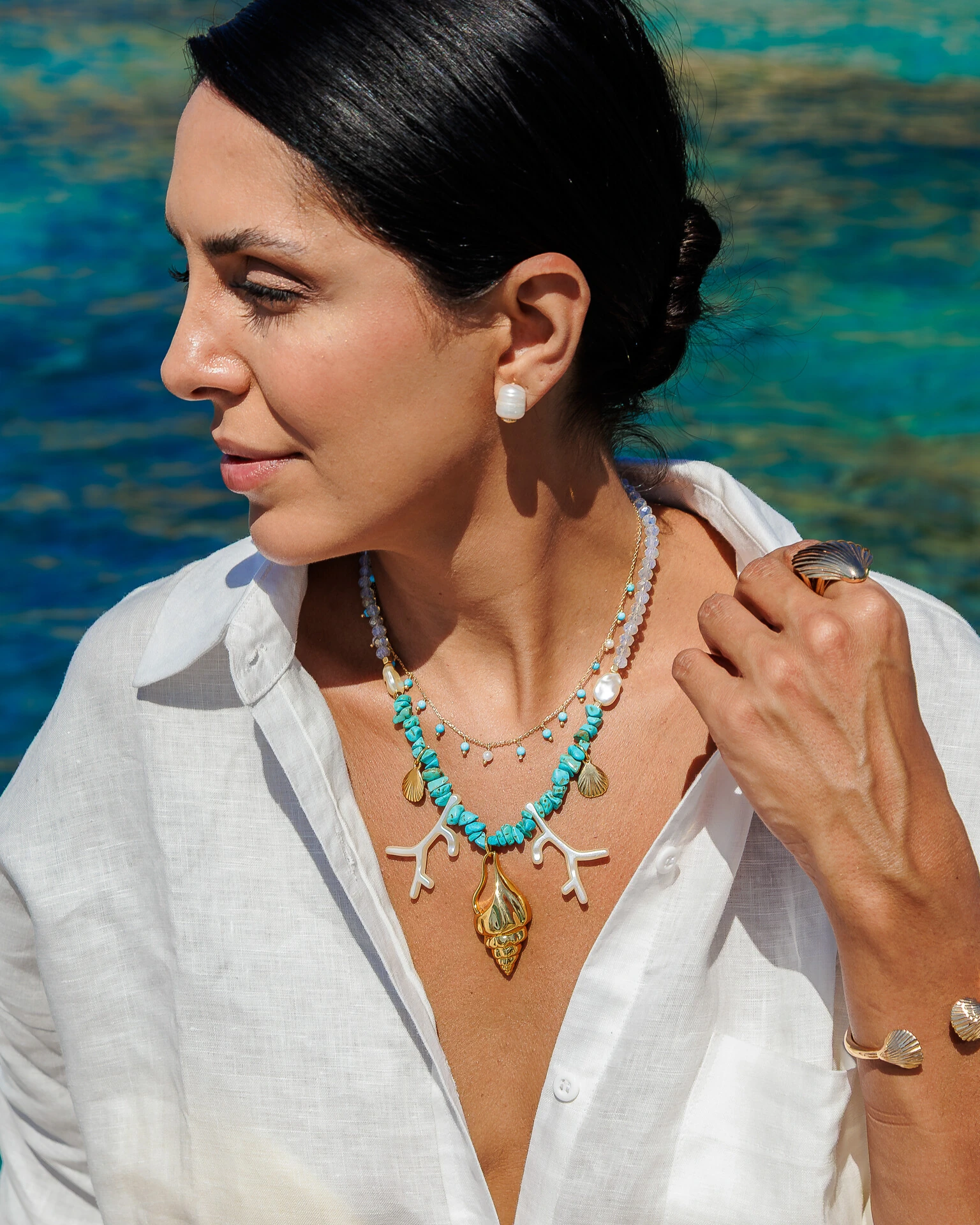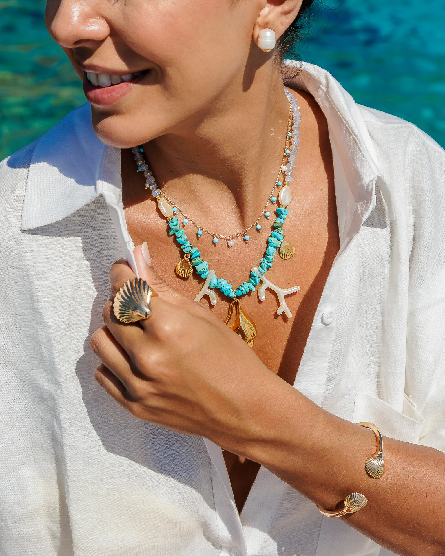 A vida marinha serve de inspiração para o delicado Bracelete Marés, em banho de Ouro 18k, de aro liso e aberto que termina em duas pequenas Vieiras.