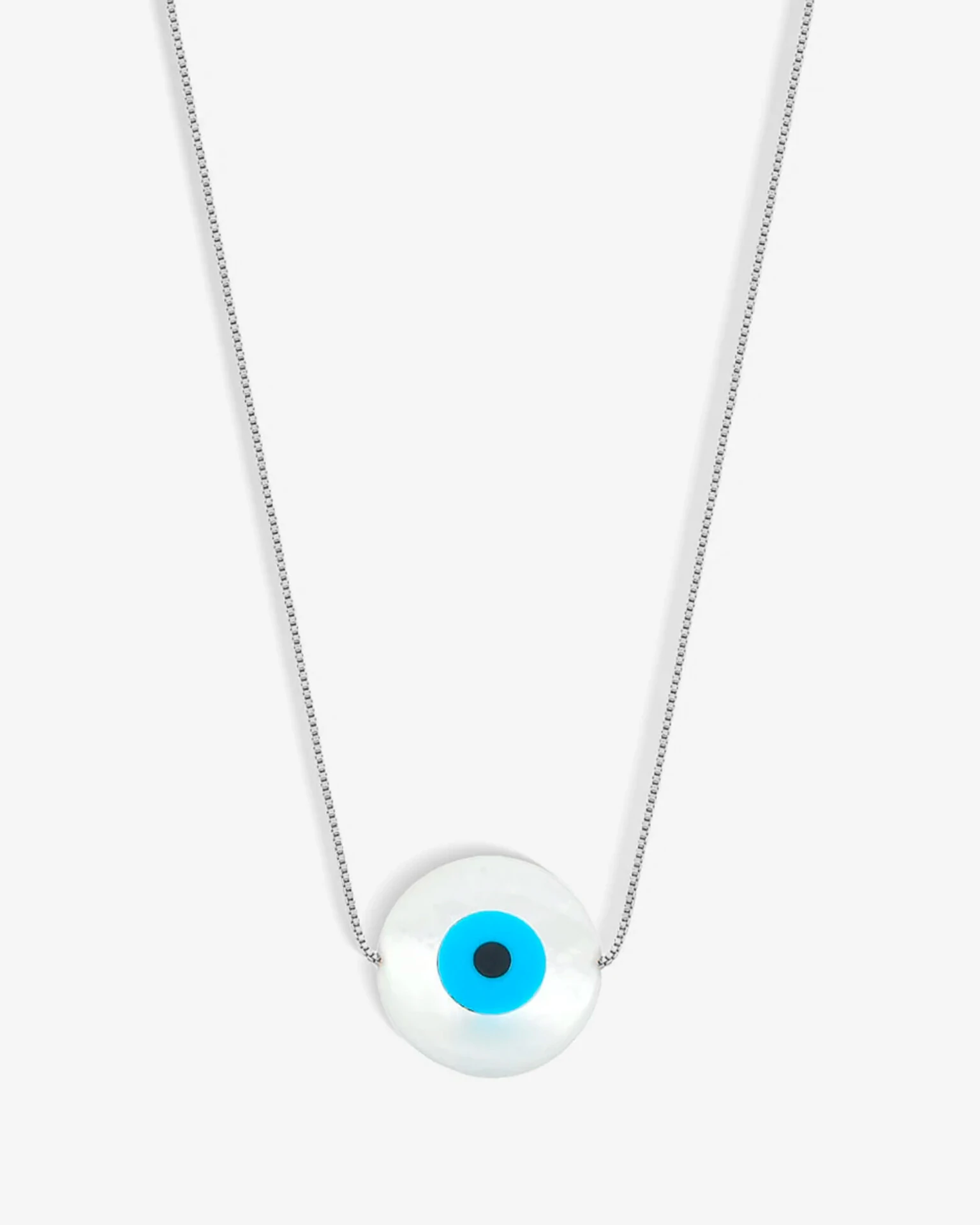 Colar delicado em banho de ouro 18k, corrente veneziana ajustável com pingente de olho grego na pedra madrepérola.