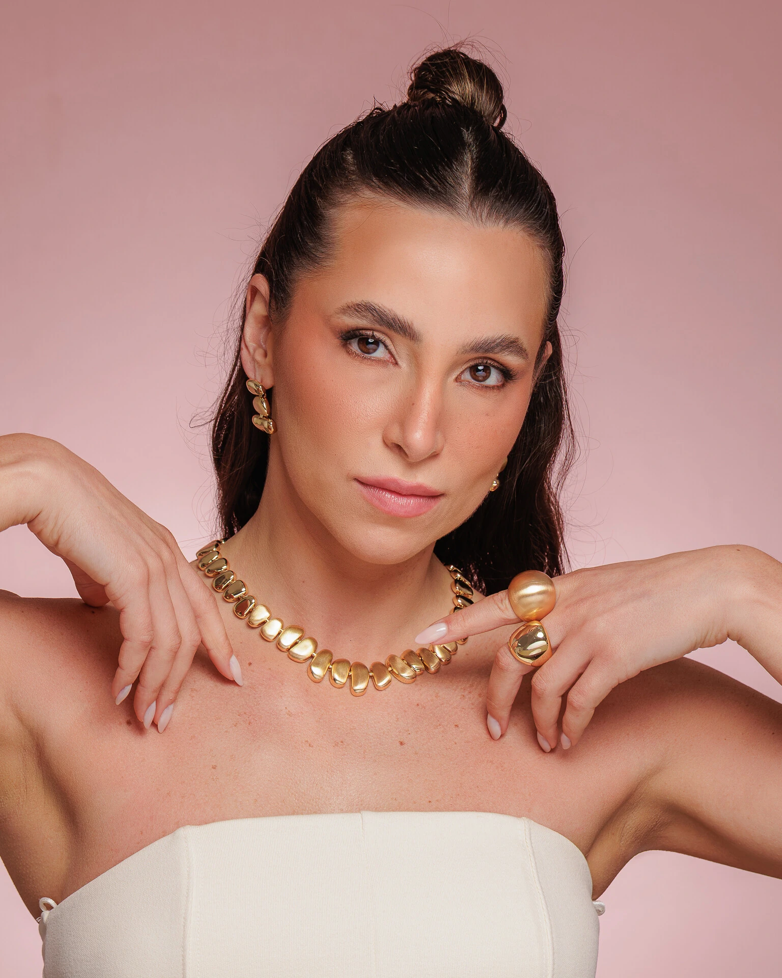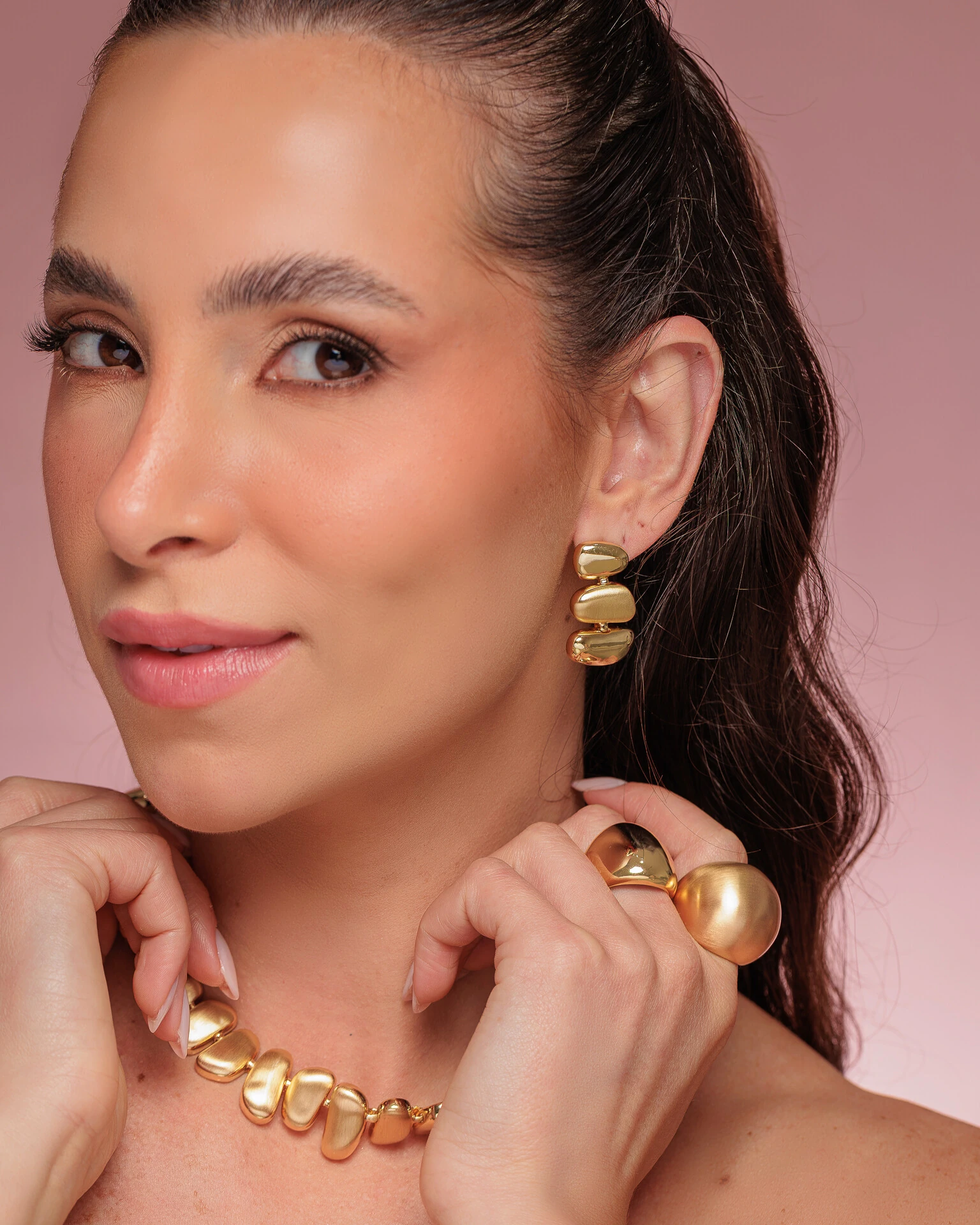 Anel redondo, abaulado, banhado a ouro acetinado. Ideal para quem busca elegância e originalidade, transmitindo um estilo atemporal e marcante.