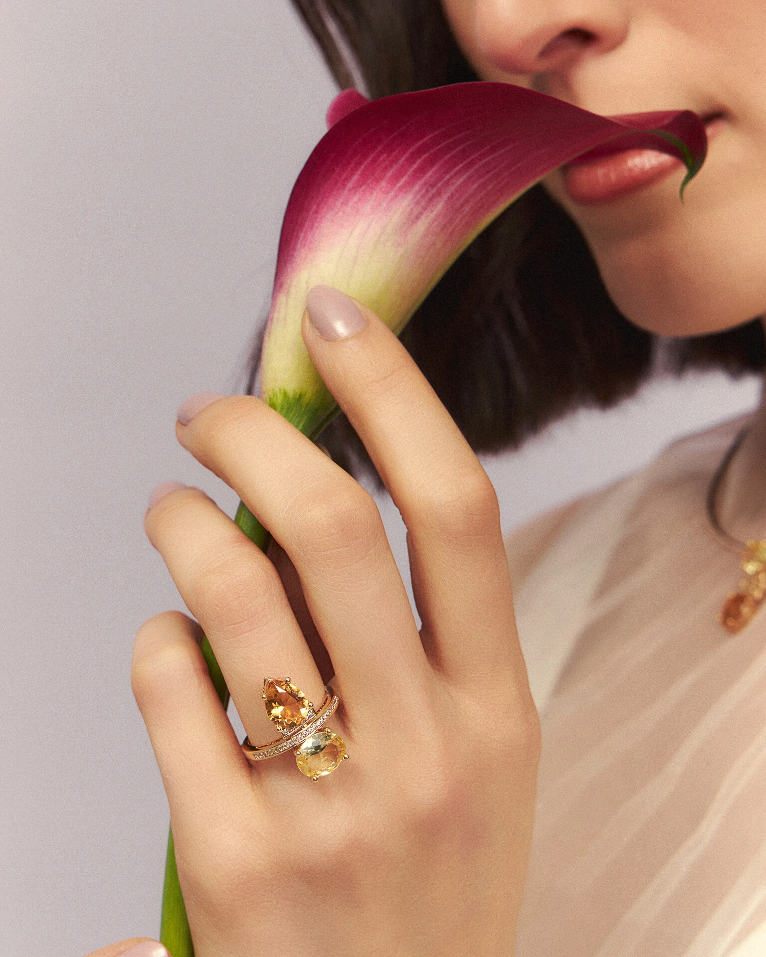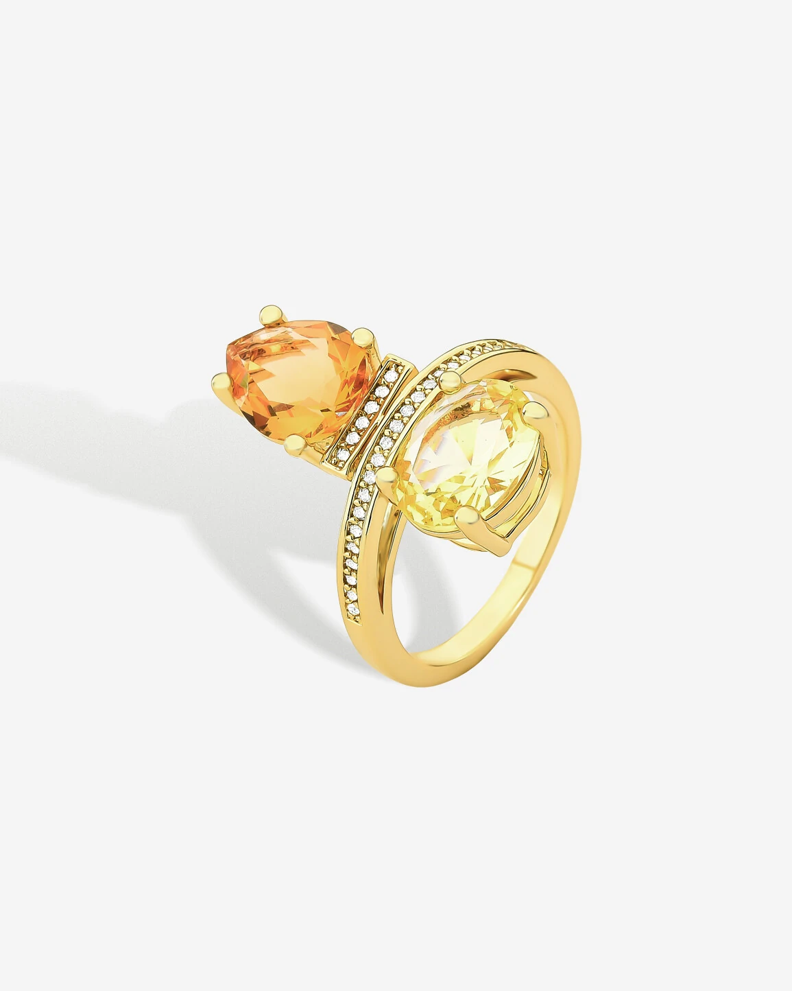 O design sofisticado do Anel Maica, é marcado pela beleza exuberante da composição em zircônias nos tons Yellow Fancy e Âmbar, unidas delicadamente ao elegante aro, que apresenta filetes finos em micro zircônias cristais. Um luxo em banho de ouro 18k, recoberto de refinamento e puro bom gosto.