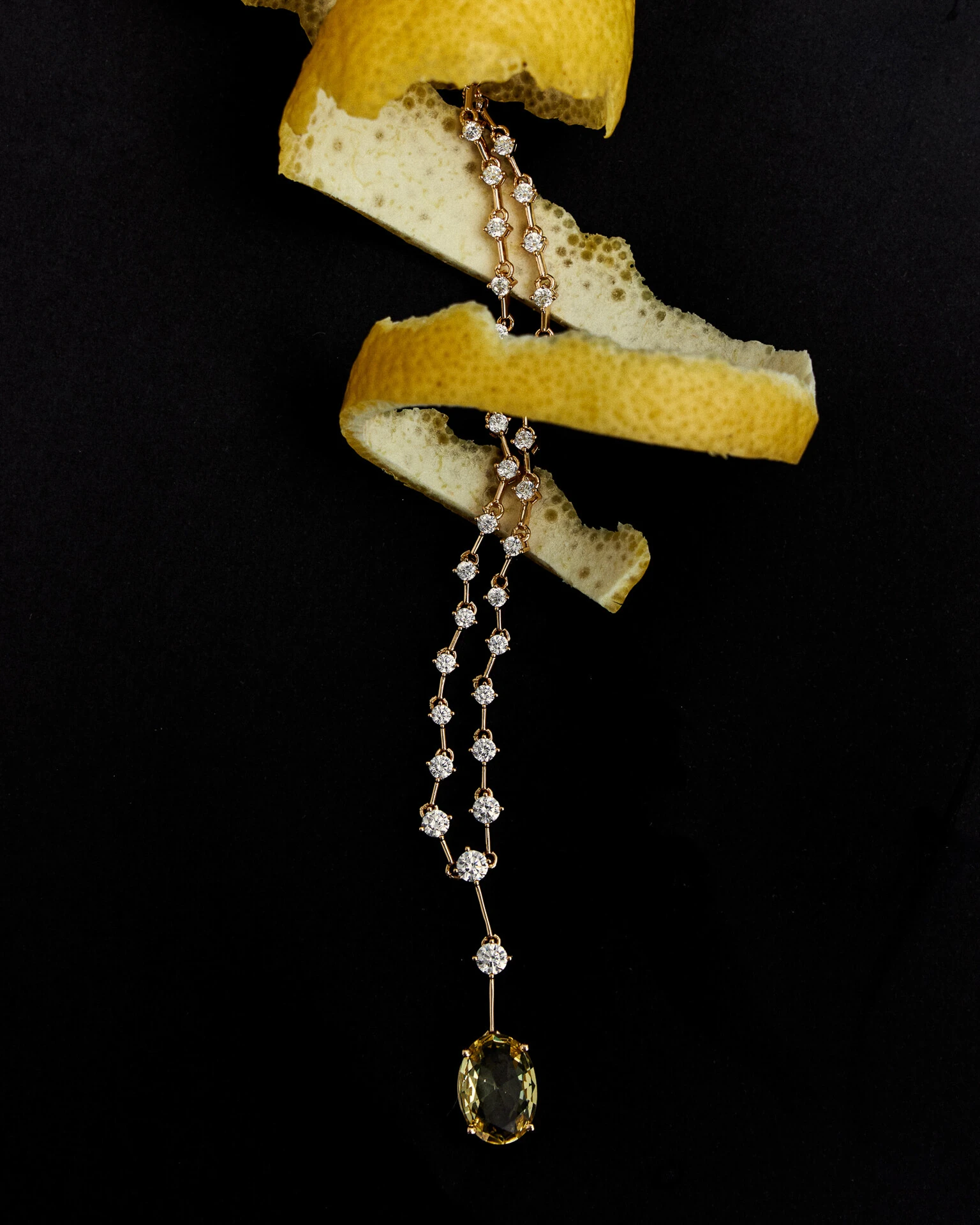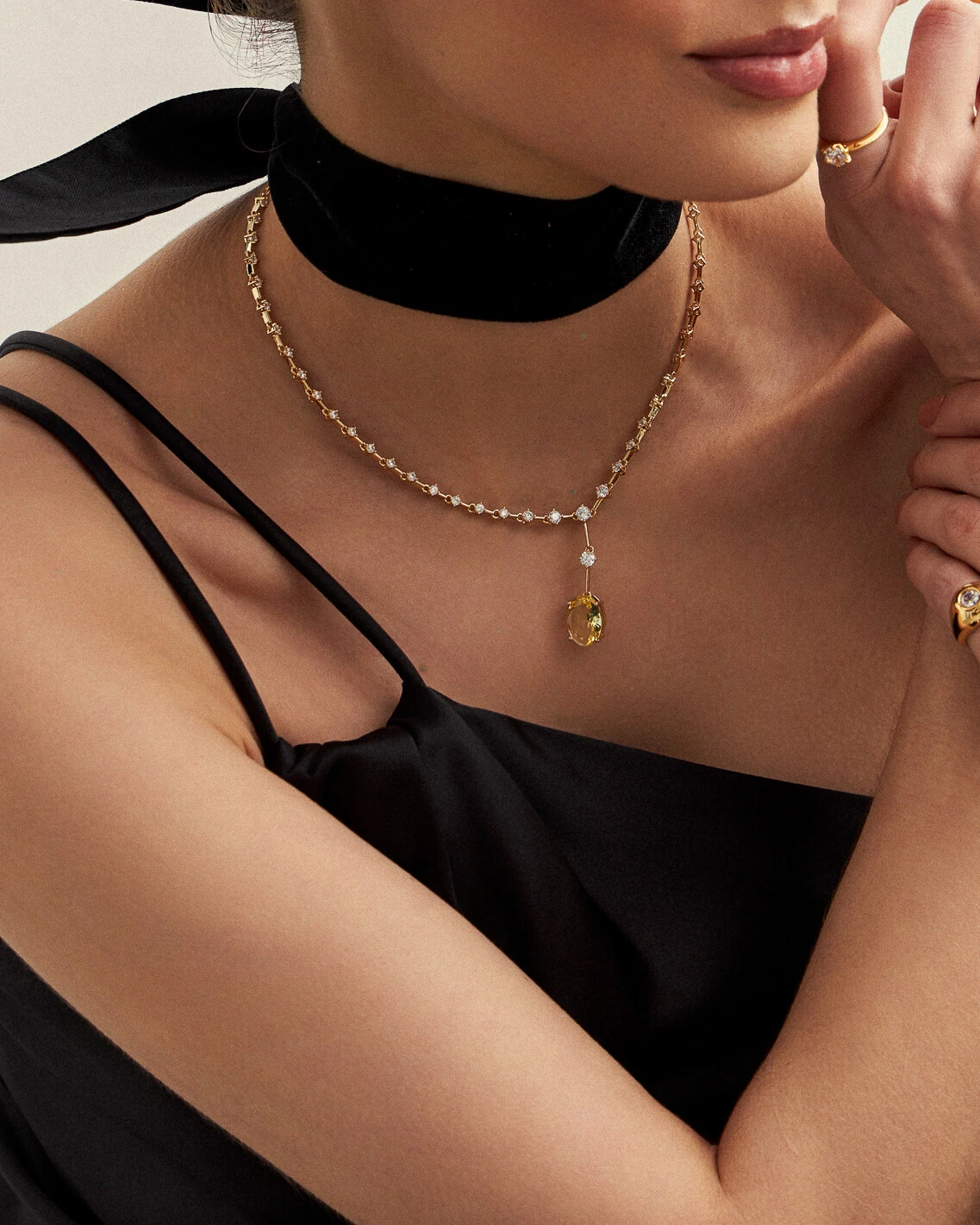 Um colar exuberante e repleto de brilhos, que combina a delicadeza cristalina de pontos de luz dispersados ao longo da elegante corrente fio faca, e a beleza vibrante da gravatinha e sua maravilhosa zircônia oval no tom Yellow Fancy. Um modelo que nos remete aos fascinantes raios de sol, que dispersam energia e nos tornam mais felizes.
