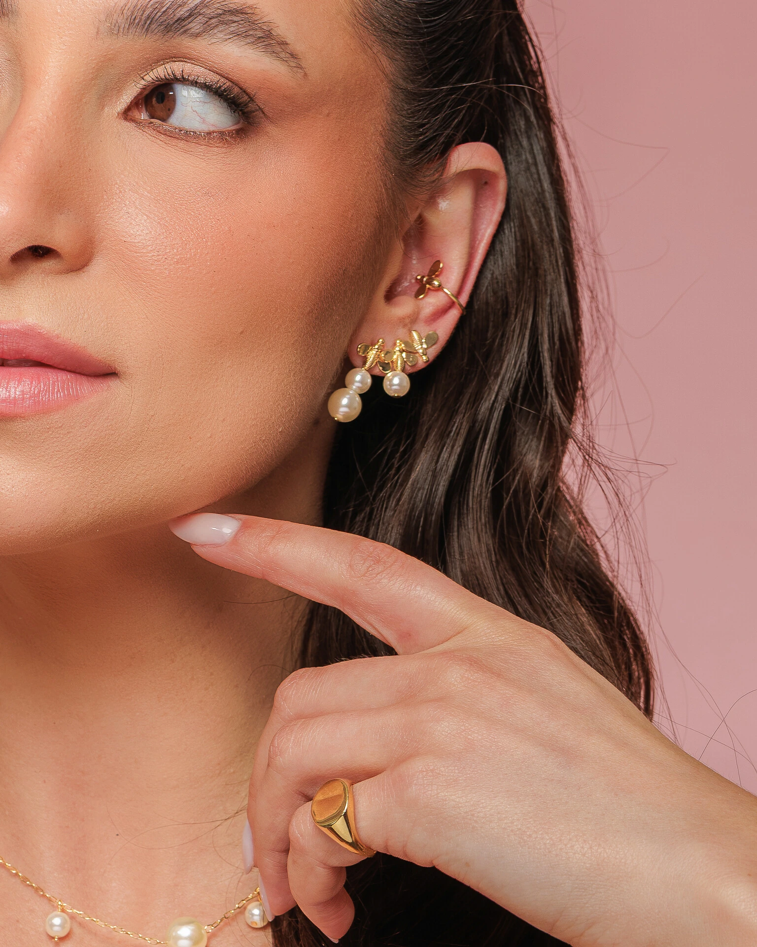 Brinco Melissa é cheio de charme. O contraste entre o dourado da abelha e o brilho suave da pérola Shell cria uma peça contemporânea, romântica e ao mesmo tempo divertida — perfeita para quem gosta de acessórios que unem delicadeza e personalidade. Em banho de ouro 18k.
