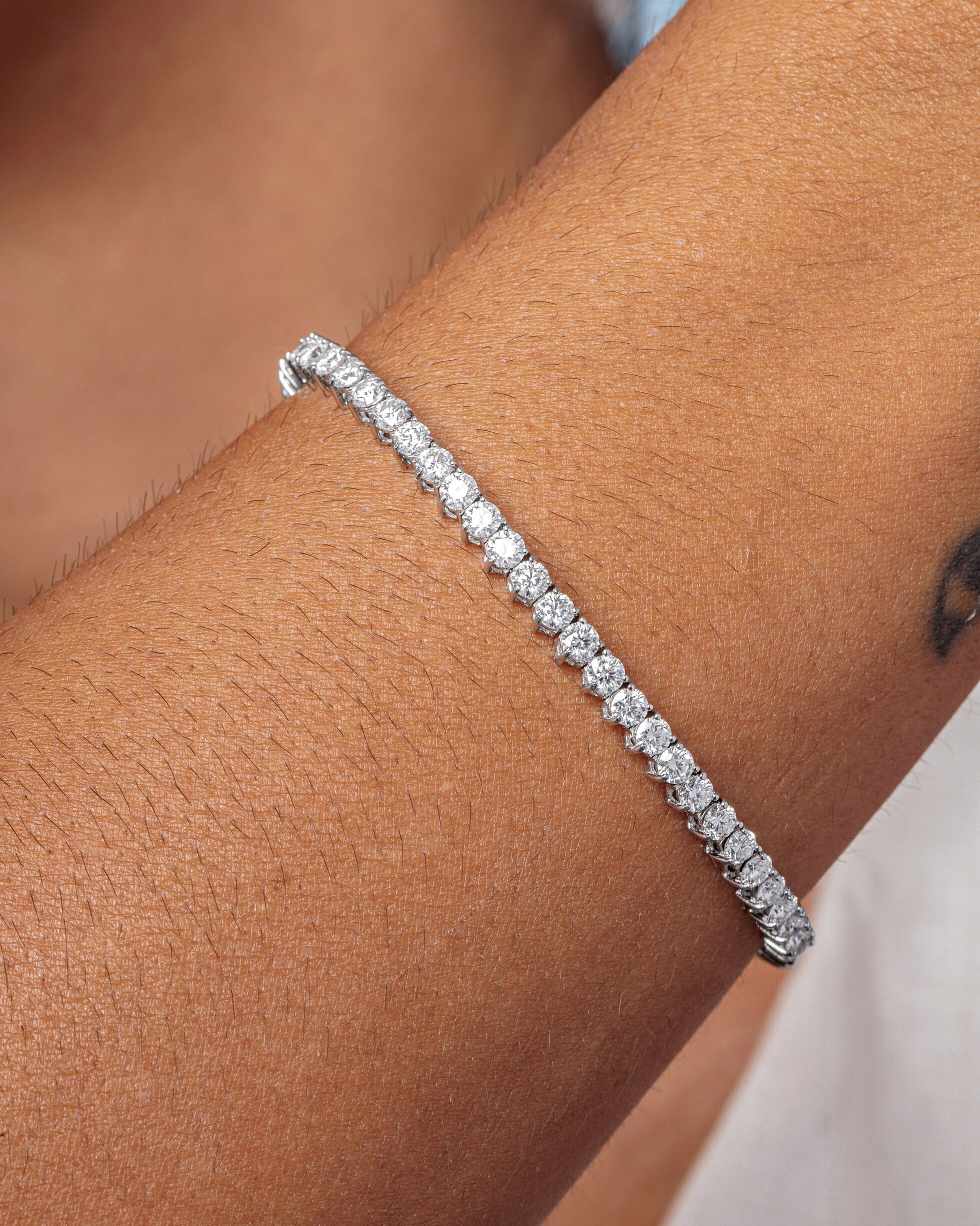 A clássica Pulseira Riviera de 17 cm, confeccionada em prata 925 com banho de ródio branco, exibe a elegância sofisticada de Moissanites 3 mm, com uma profusão maravilhosa de reflexos que a transformam em uma joia irresistível. Possui fecho gaveta e trava de segurança.