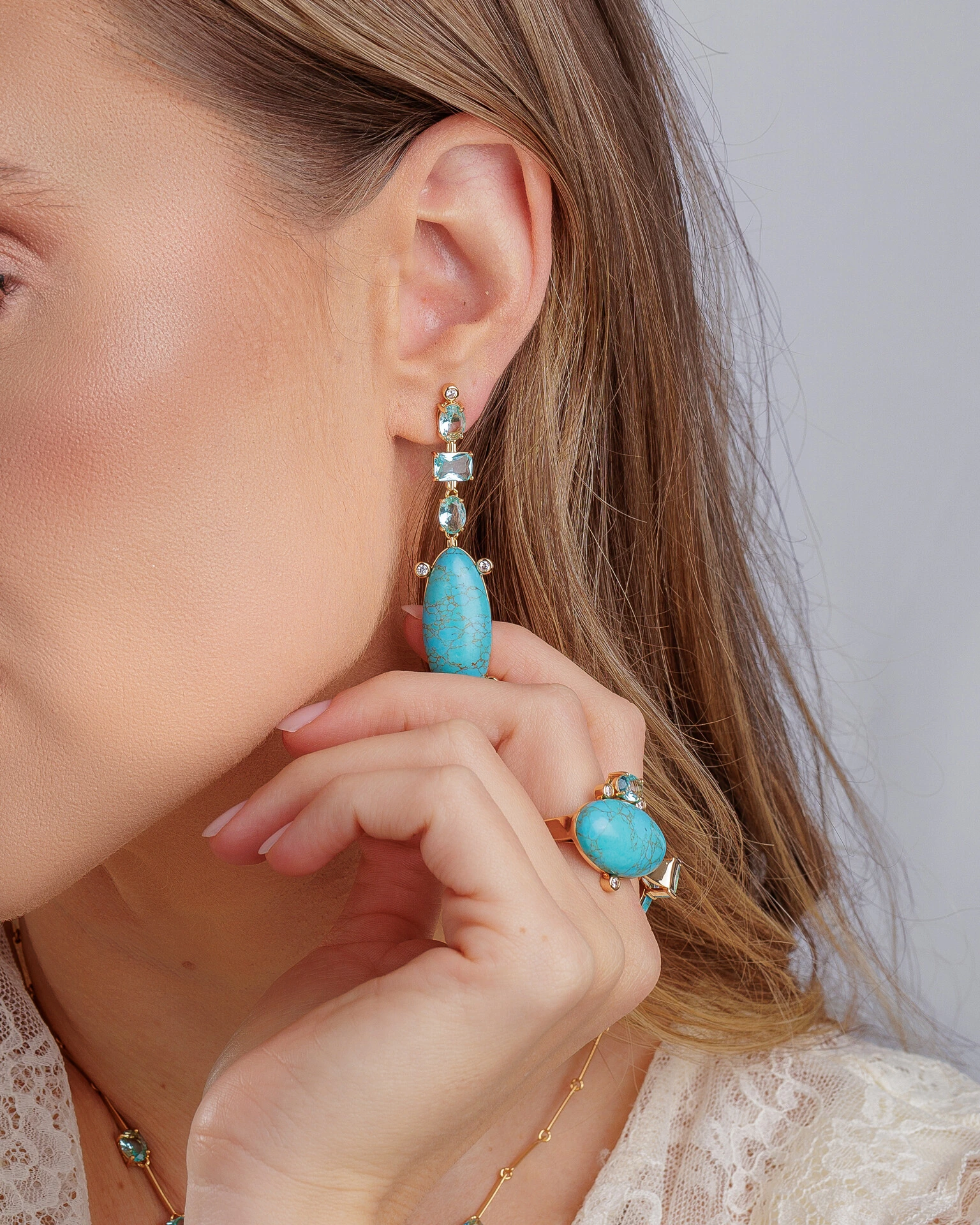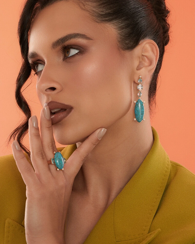 A impactante beleza do Brinco Soline se deve as maravilhosas nuances de azul, que recobrem delicadas formas geométricas com zircônias no tom água marinha, ou na imponente Turquesa Reconstituida, arrematadas por pequenos pontos de luz que conferem um must de refinamento ao conjunto.