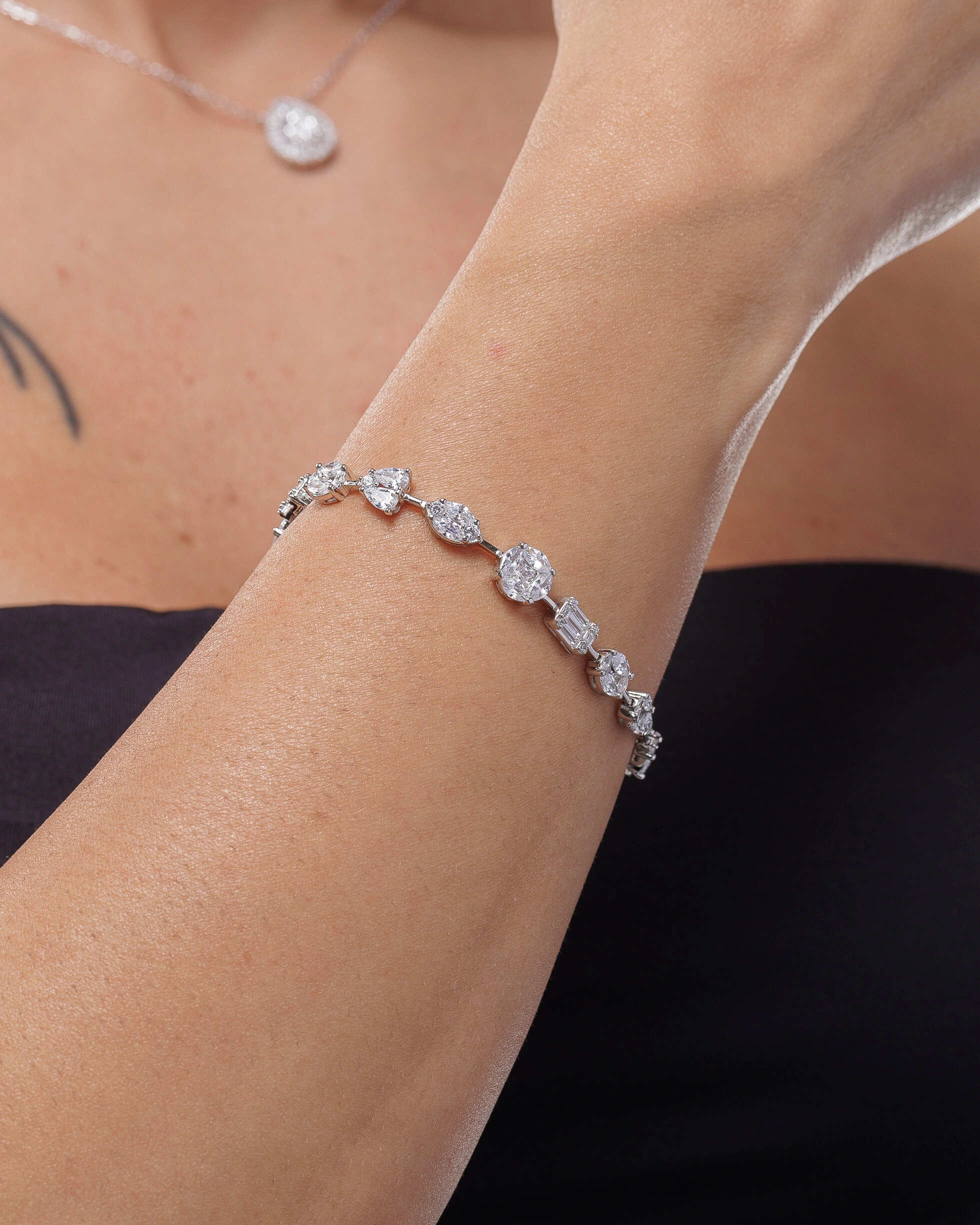 A refinada estrutura da Pulseira Riviera Luisa, apresenta corrente fio faca com haste lisa e contínua, e uma composição alternada de zircônias cristais em diferentes lapidações. Joia em prata 925 com banho de Ródio branco. Um modelo repleto de brilhos, especialmente pensado para os momentos que exigem um look sutilmente elegante.