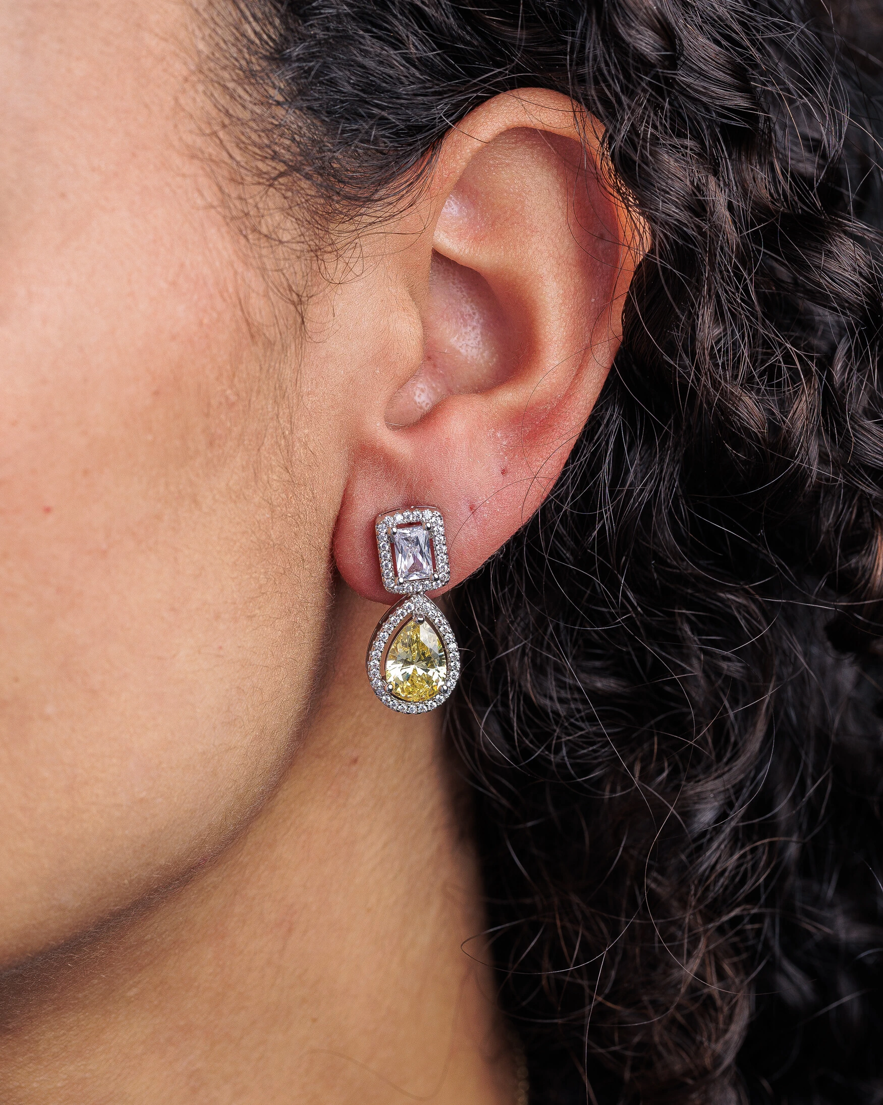 Brinco Marceline, em banho de ródio branco, exibe uma elegante composição de diferentes tonalidades com molduras recobertas pelo brilho de zircônias cristais; o brinco na lapidação retangular apresenta uma maravilhosa zircônia da mesma tonalidade de sua moldura, o pingente de Gota destaca a beleza da zircônia na elegante tonalidade Yellow Fancy. Um conjunto de reflexos vibrantes que valorizam e destacam qualquer look.