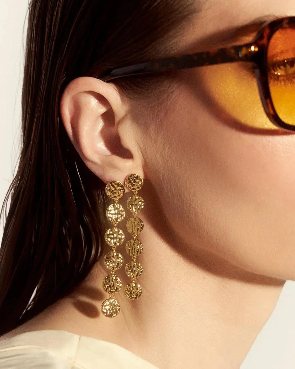 Um modelo de Ear Line de caimento leve e super elegante, o Brinco Medalhas, em banho de ouro 18k, é formado por uma cortina de medalhinhas texturizadas com efeito martelado, perfeito para quem ama um visual moderno e repleto de estilo.