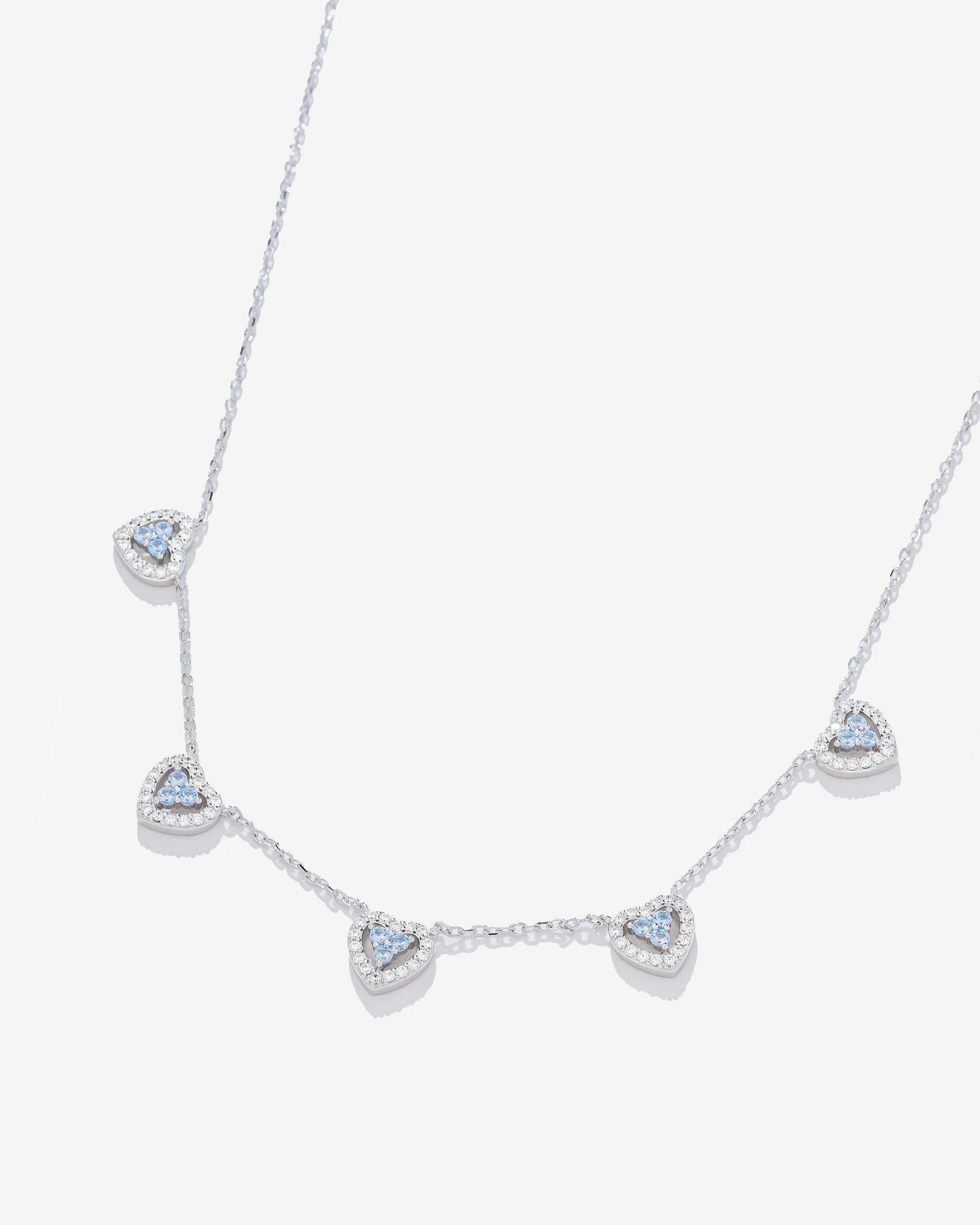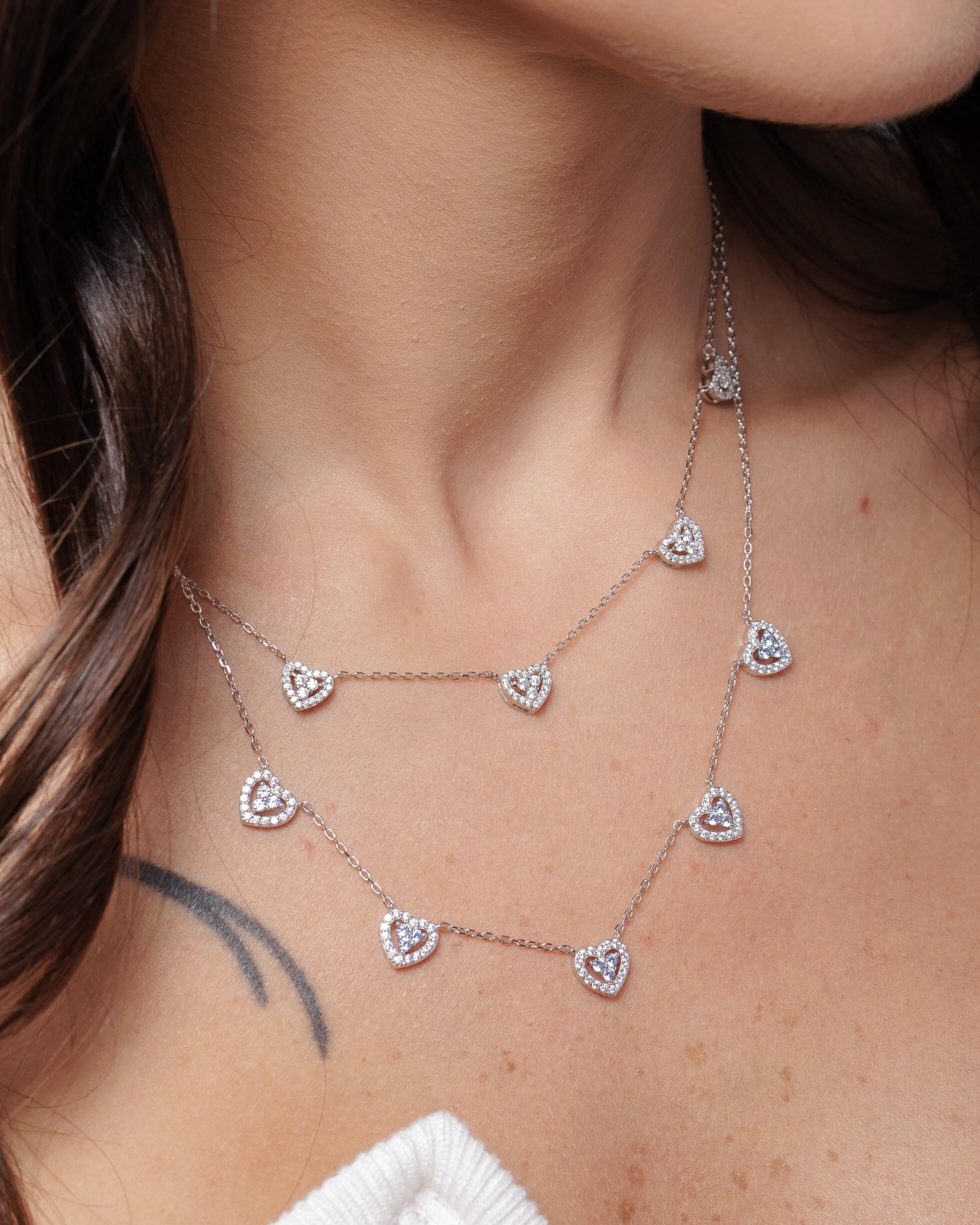 Os pequenos corações revestidos de zircônias, simbolizam o amor através do maravilhoso colar Gisela, uma elegante joia de prata 925, agora em nova cor de zircônia: Água Marinha.