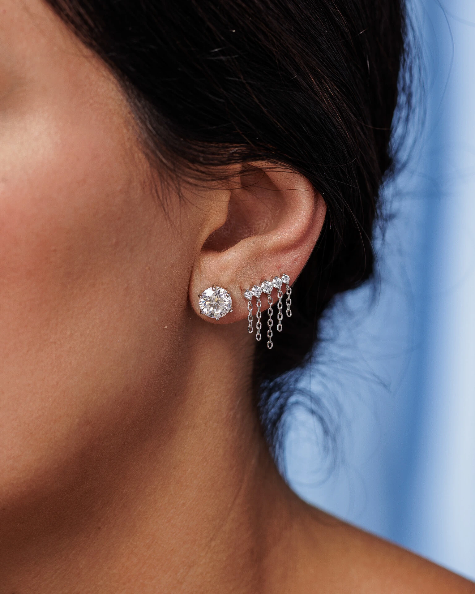 Brinco Angeline, em banho de ródio branco, confeccionando em Prata 925. Com pedras moissanites em três tamanho diferentes com corrente, trazendo um charme e deixando a peça única