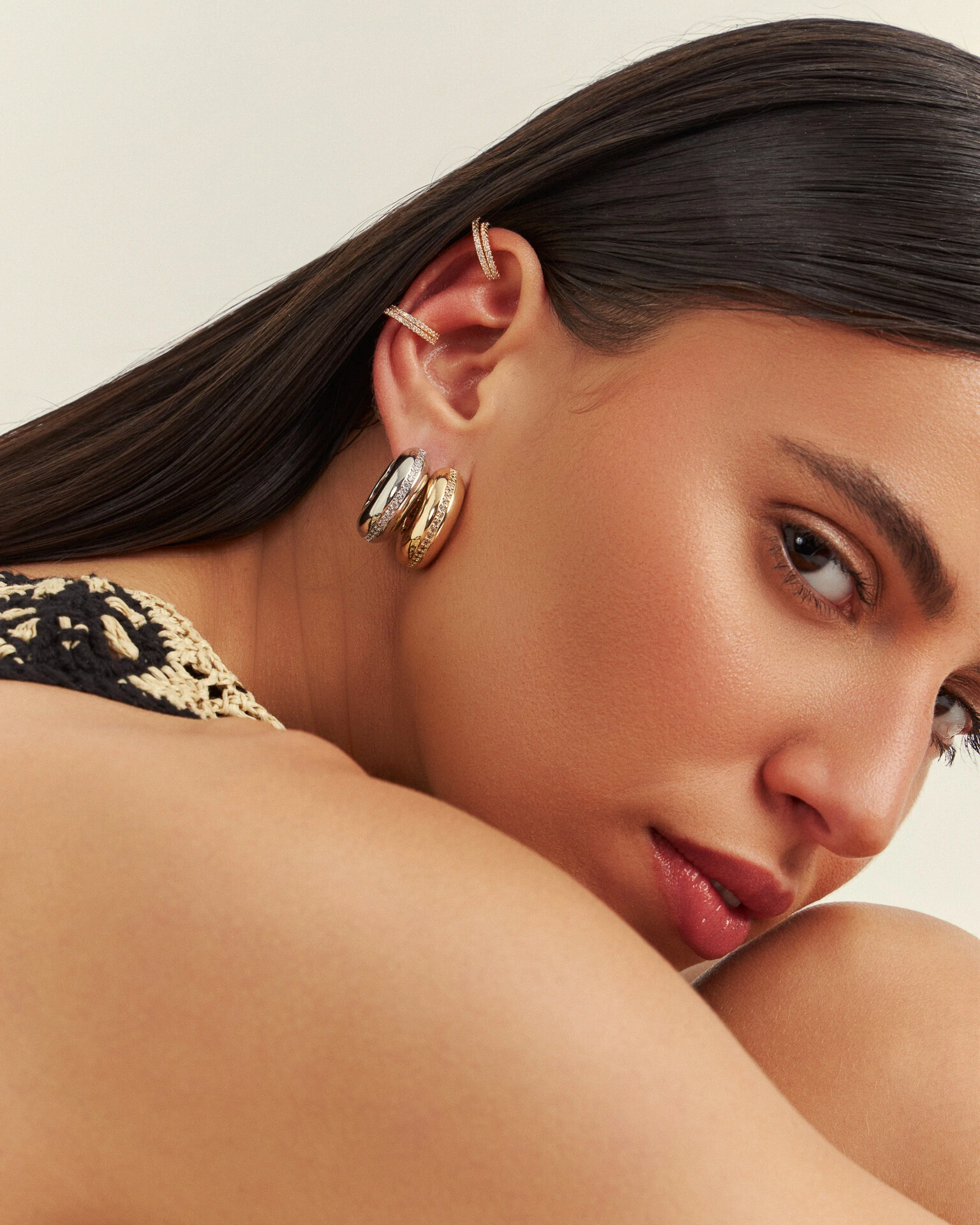 Argola de design robusto e sofisticado, com acabamento polido e cravação delicada que valoriza o brilho da peça. Um clássico moderno, elegante e versátil, perfeito para elevar qualquer produção com discrição e luxo.