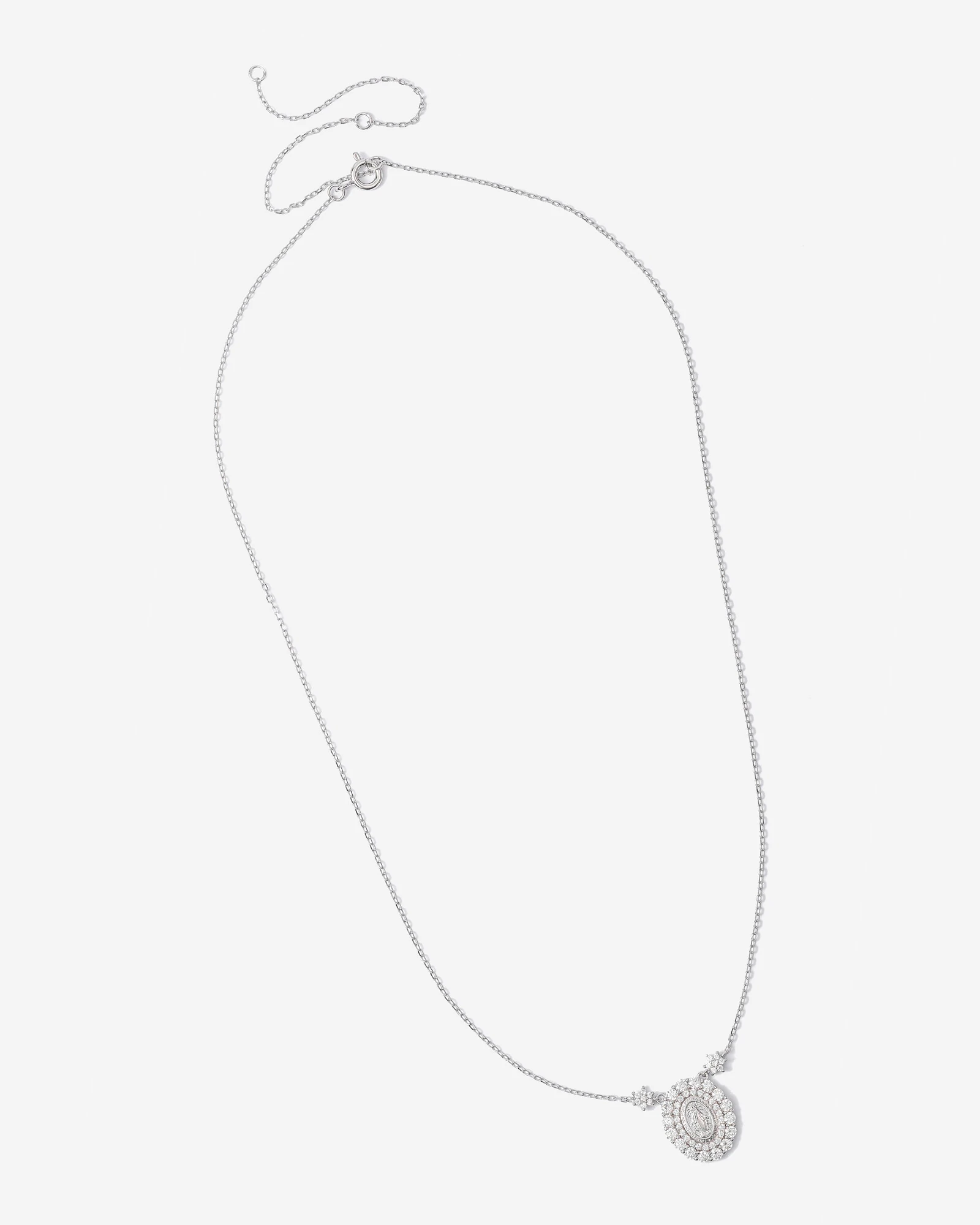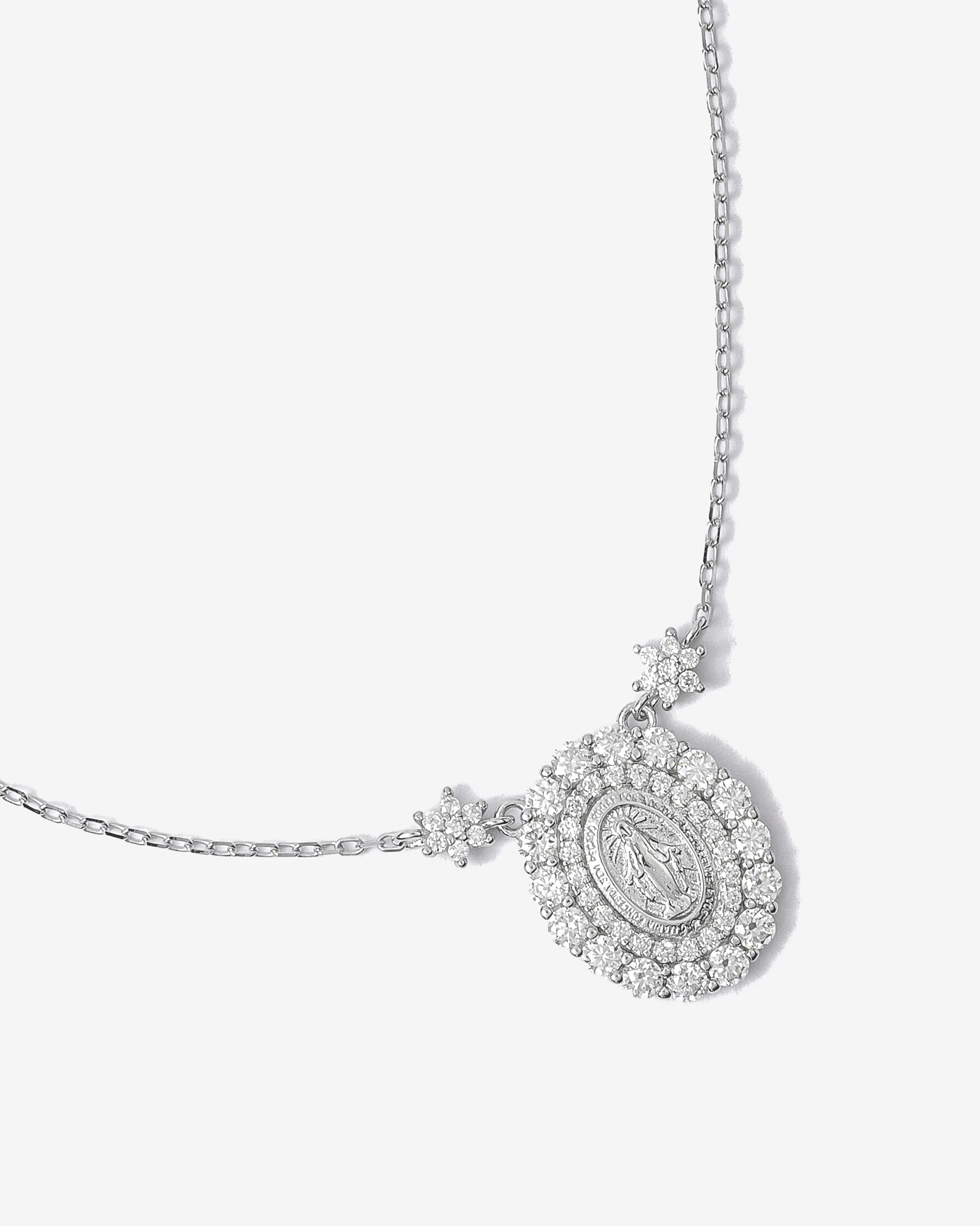 O medalhão recoberto de Moissanites criam um fundo com reflexos incríveis que realçam a adorada imagem de Nossa Senhora das Graças. Delicada joia de estilo religioso, confeccionada em prata 925 com banho de ródio branco, perfeita para fazer maravilhosas composições com outros modelos de nossas coleções.